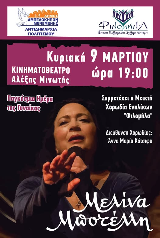 Ο Δήμος Αμπελοκήπων-Μενεμένης τιμάει και φέτος την Παγκόσμια Ημέρα της Γυναίκας και σας προσκαλεί την Κυριακή 9/3 στις 7μ.μ. στο Δημοτικό Κινηματοθέατρο «Αλέξης Μινωτής» (Πατρ. Γρηγορίου Ε’ 12, Αμπελόκηποι) σε μία μουσική εκδήλωση αφιερωμένη στη γυναίκα με την συμμετοχή της Μεικτής Χορωδίας Ενηλίκων «Φιλομήλα» υπό τη διεύθυνση της Άννας Μαρίας Κότσιφα.