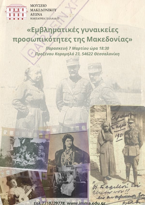 Στο πλαίσιο εορτασμού της Παγκόσμιας Ημέρας της Γυναίκας, το Ίδρυμα Μουσείου Μακεδονικού Αγώνα και της Νεότερης Ιστορίας της Μακεδονίας (ΙΜΜΑ) πραγματοποιεί και σας προσκαλεί σε διαδραστική εκδήλωση για την ανάδειξη τεσσάρων εμβληματικών γυναικών που έδρασαν στον χώρο της Μακεδονίας, την Παρασκευή 7 Μαρτίου και ώρα 18.30 στο Μουσείο Μακεδονικού Αγώνα.