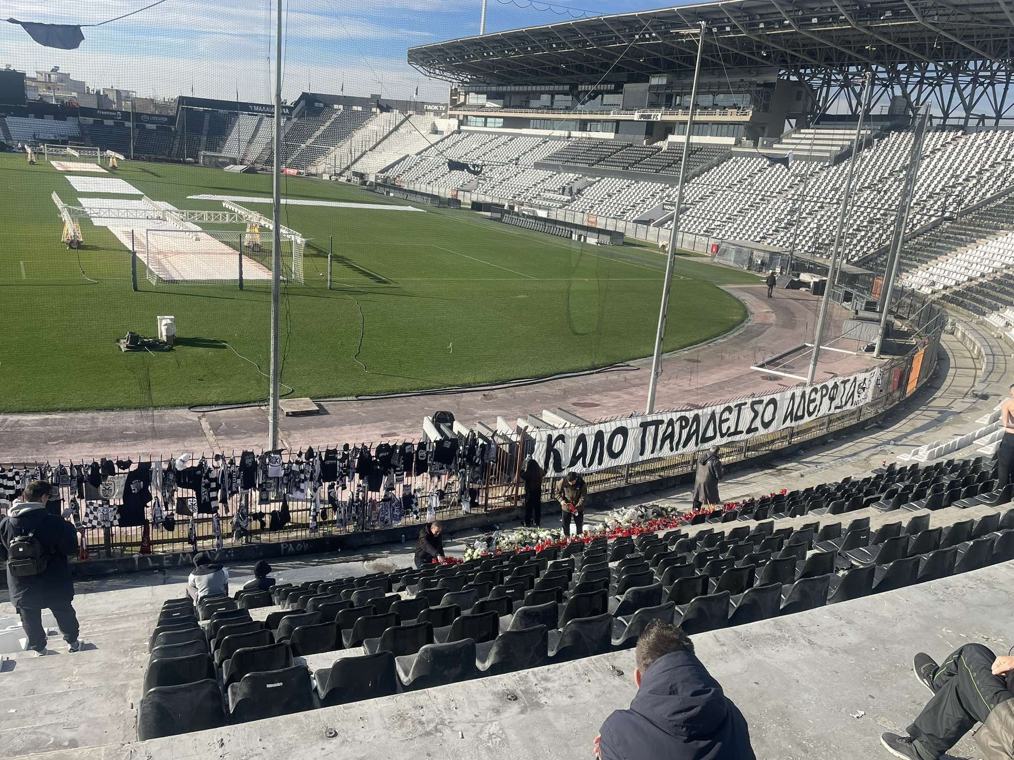 Άνθρωποι κάθε ηλικίας, γιαγιάδες με εγγόνια, μικροί και μεγάλοι φίλοι του ΠΑΟΚ, οργανωμένοι οπαδοί, αλλά και απλοί φίλαθλοι πηγαίνουν και αφήνουν στα κάγκελα ένα κασκόλ και στα καθίσματα ένα κεράκι και μερικά λουλούδια.