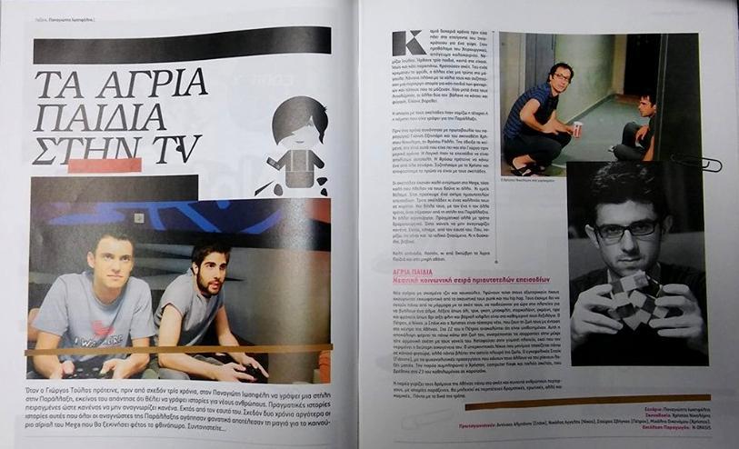 Τον Σεπτέμβριο του 2008, στο 144ο τεύχος της Parallaxi, αφιερώσαμε το εξώφυλλο σε αυτό το τηλεοπτικό success story που υπήρξε made in Thessaloniki. Και όχι μόνο… Τα «Άγρια Παιδιά» ήταν επί της ουσίας μια δημοφιλής στήλη της Parallaxi, γραμμένη από τον Παναγιώτη Ιωσηφέλη, που μετά από δυο χρόνια έντυπης ζωής μεταφέρθηκε στη μικρή οθόνη!