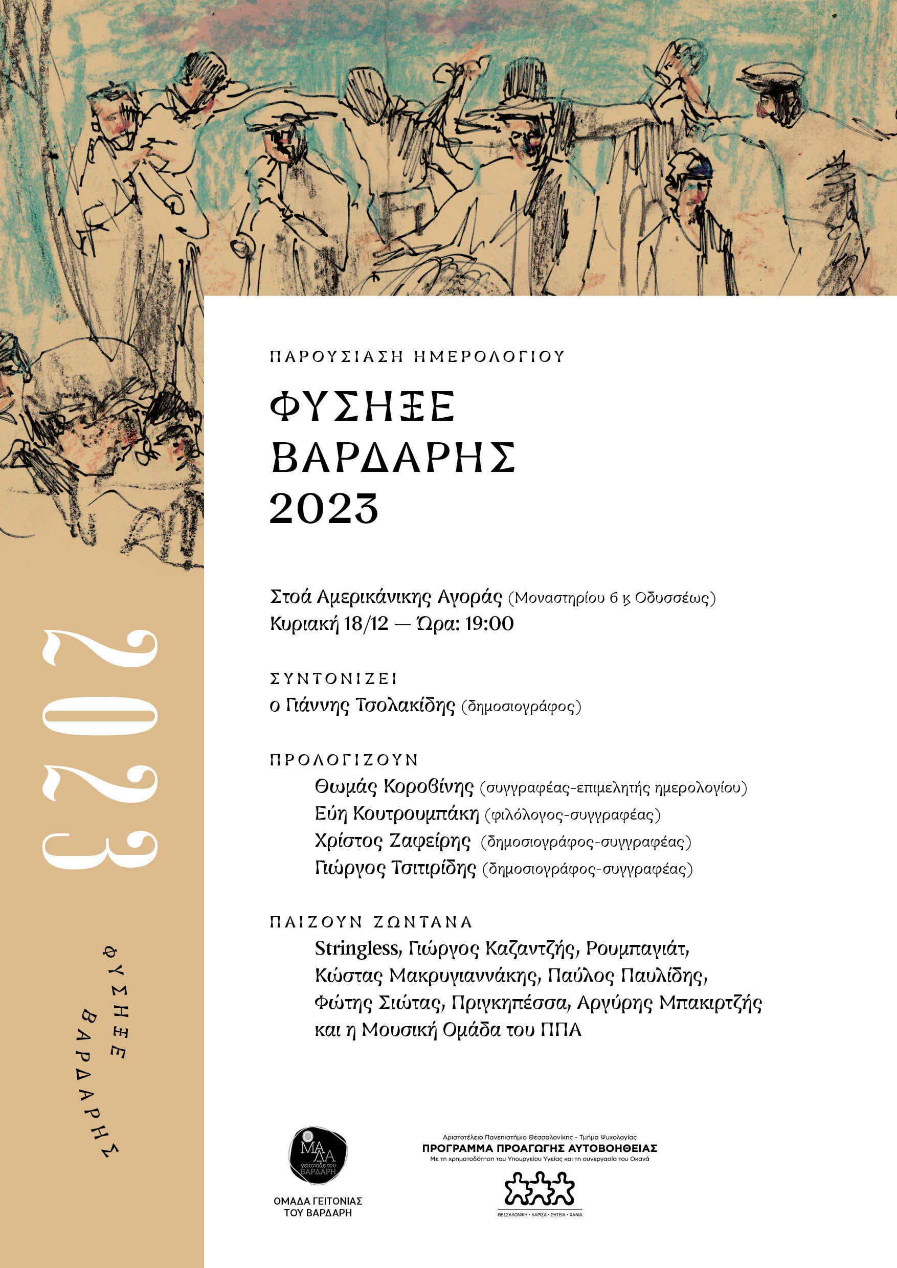 Το τέταρτο κατά σειρά θεματικό ημερολόγιο «Φύσηξε Βαρδάρης 2023» της «Ομάδας Γειτονιάς του Βαρδάρη» του Προγράμματος Προαγωγής Αυτοβοήθειας του ΑΠΘ παρουσιάζεται την Κυριακή 18 Δεκεμβρίου 2022, στις 19.00 στην στοά της Αμερικάνικης Αγοράς (Μοναστηρίου 4 & Οδυσσέως).