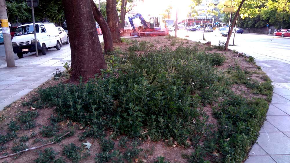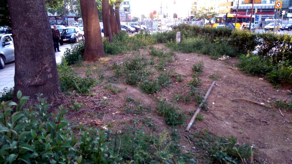 Την ίδια εικόνα εγκατάλειψης με τα παρτέρια μπροστά στη Δ.Ε.Θ. παρουσιάζουν και τα παρτέρια στην Πλατεία Δημοκρατίας, δεξιά και αριστερά από το άγαλμα του Κωνσταντίνου.