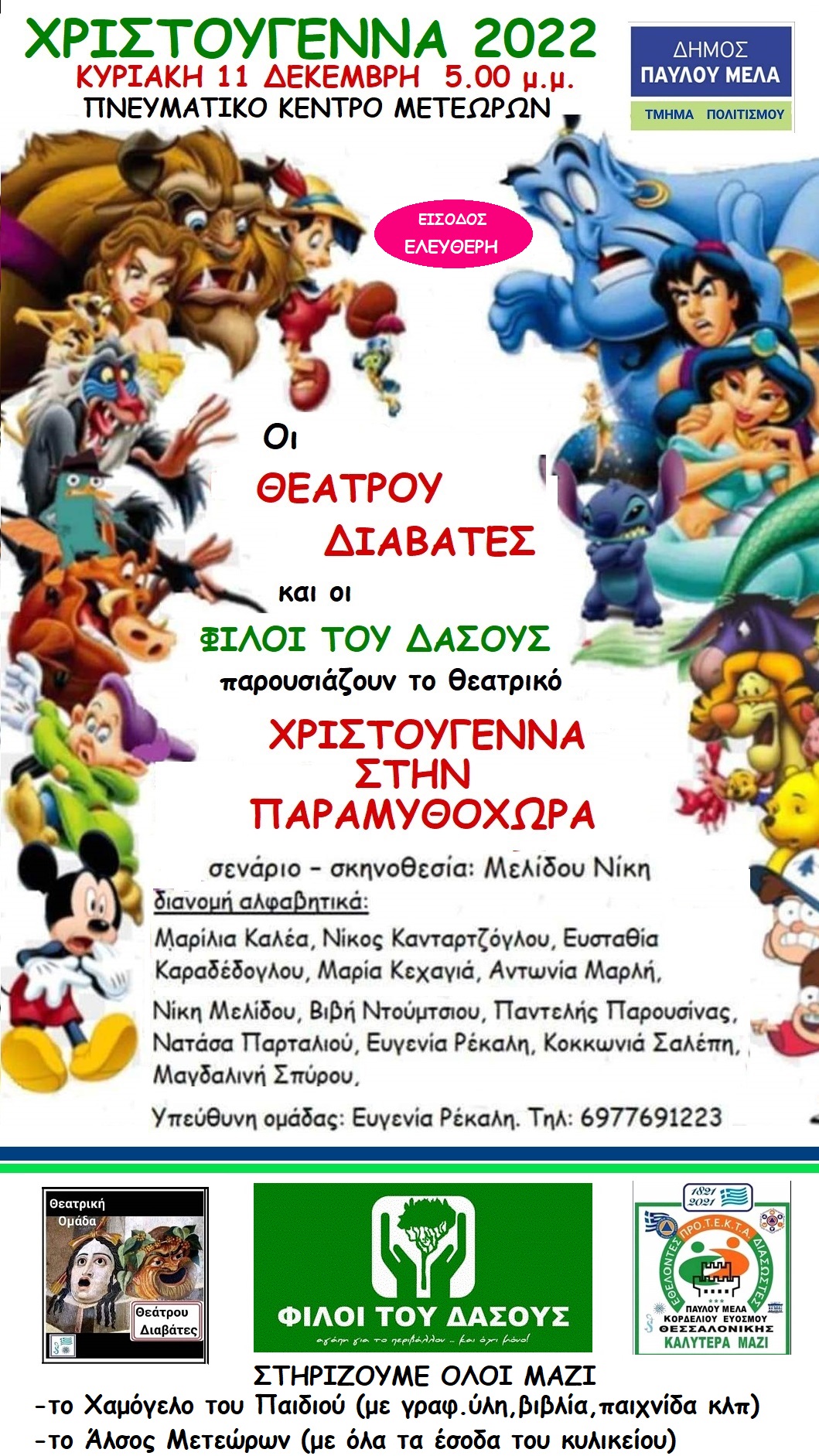 Η θεατρική ομάδα «Θεάτρου Διαβάτες» και οι “Φίλοι του Δάσους” παρουσιάζουν το χριστουγεννιάτικο έργο για παιδιά και μεγάλους: ΧΡΙΣΤΟΥΓΕΝΝΑ ΣΤΗΝ ΠΑΡΑΜΥΘΟΧΩΡΑ Επί τέλους!!!! Ξημερώνουν Χριστούγεννα!!! Όλα τα παιδιού του κόσμου περιμένουν τα δώρα τους. Ο Αι Βασίλης έρχεται!!! Μα φέτος θα γίνει ανατροπή. Ο καημένος ο Αι Βασίλης είναι άρρωστος πολύ. Κι έτσι αναλαμβάνουν τα καλικαντζαράκια δράση. Ζαβολιάρικα καθώς είναι, θα κάνουν φάρσες κι εκπλήξεις στους ήρωες της Παραμυθοχώρας. Μα οι ζαβολιές τους μόνο χαρά φέρνουν κι αγάπη….κι όλα στο τέλος συγχωρούνται. Και ζήσαν όλοι καλά κι εμείς καλύτερα.