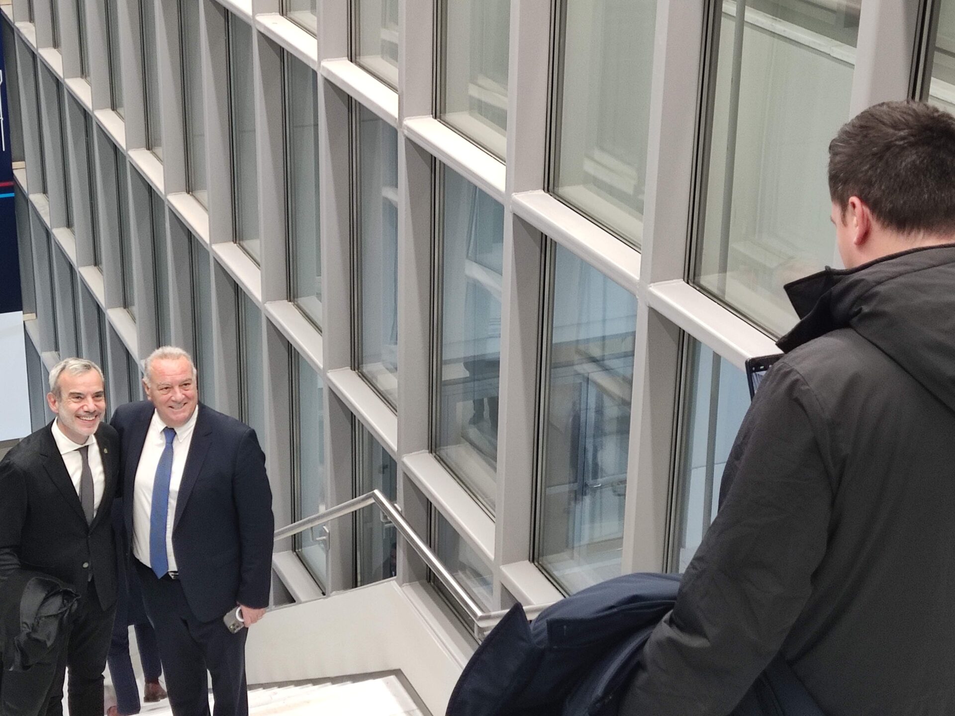 Ξαφνικά ακούω έναν πολιτισμένο μεν αλλά έντονο διάλογο. Γυρίζω και βλέπω το Χρήστο Σταϊκούρα, τον Υπουργό Υποδομών και Μεταφορών, να συνομιλεί με έναν νέο άντρα σε αμαξίδιο. Το μπουφάν του άντρα είναι βρεγμένο.