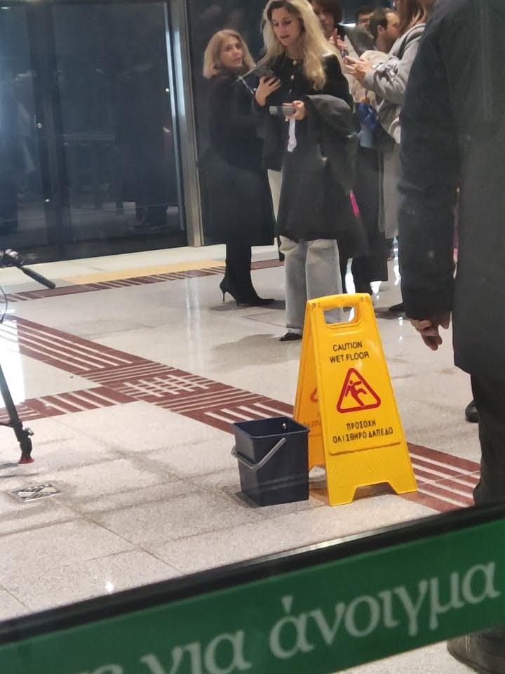 Το εκνευριστικό ψιλόβροχο κι ο αέρας παραγίνονται ενοχλητικά. Μπαίνω μέσα στο σταθμό, όπου μία κυρία μαζεύει τα νερά και τις λάσπες που φέρνουμε ερχόμενοι από τη θεομηνία έξω. Ένα γερό καιρικό μπάσιμο, λοιπόν, για τα πλακάκια στους σταθμούς του μετρό. Όμορφα αλλά και ολισθηρά, τα άτιμα!