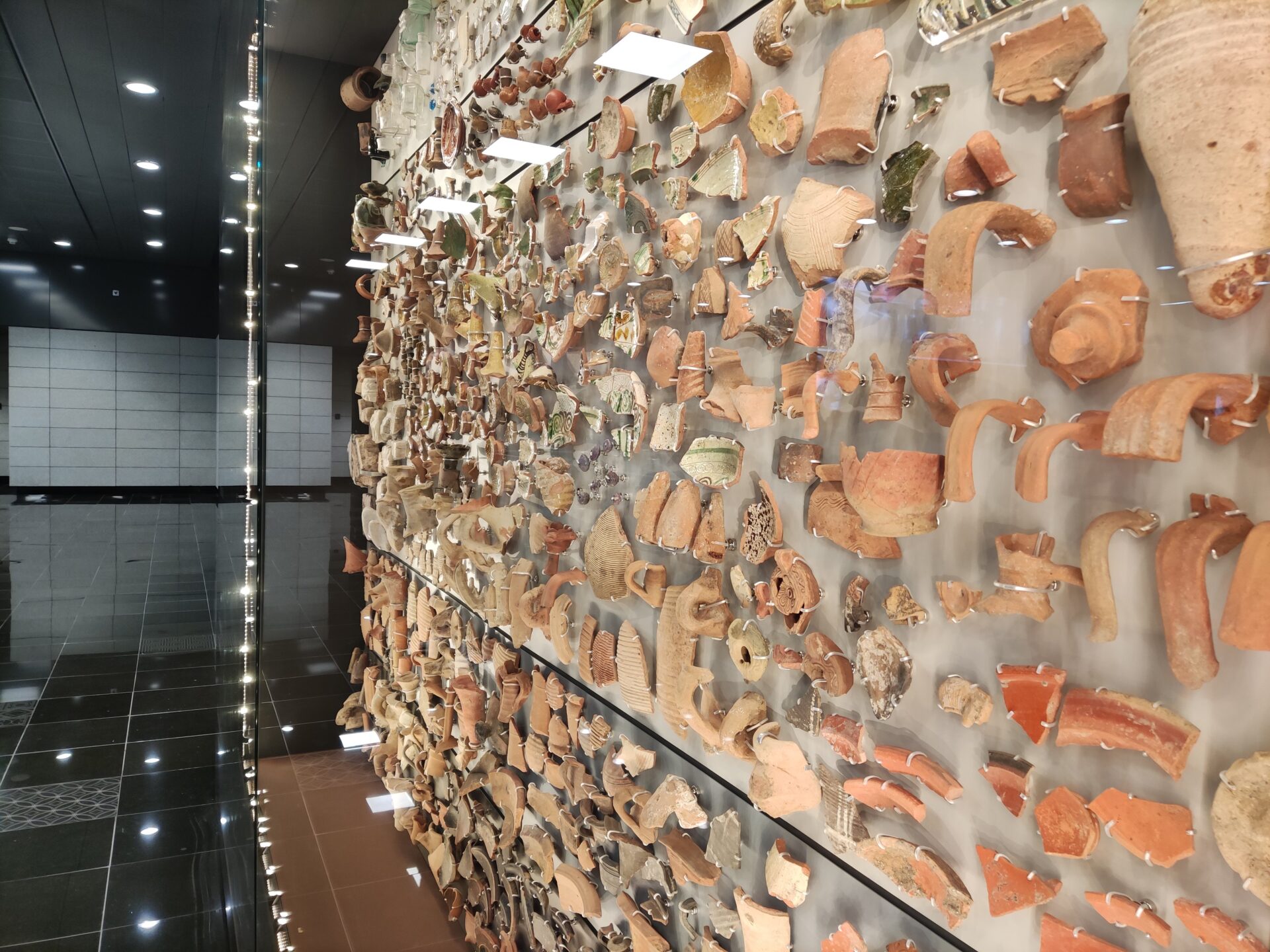 Στο σταθμό Δημοκρατίας στέκομαι σε μια ακόμα προθήκη με 13 αμφορείς του 450 μ.Χ. Προσπαθώ να φανταστώ από ποια χέρια πέρασαν, πού σερβιρίστηκε το κρασί που περιείχαν, πώς άντεξαν τόσα χρόνια, για να φτάσουν σήμερα να εκτίθενται σε χιλιάδες φευγαλέα ζευγάρια μάτια καθημερινά.