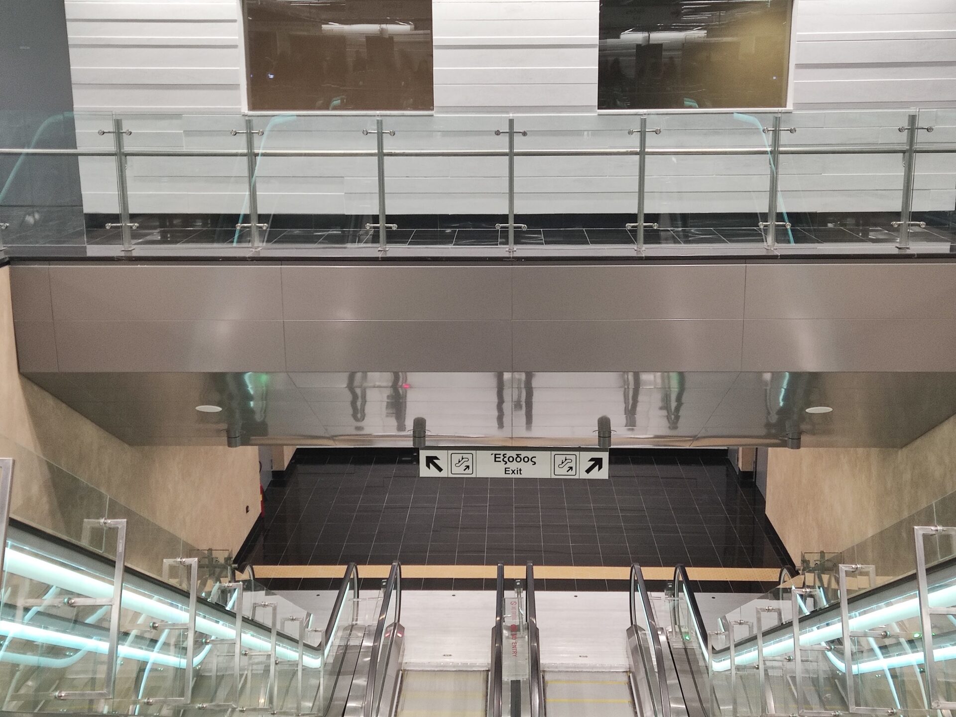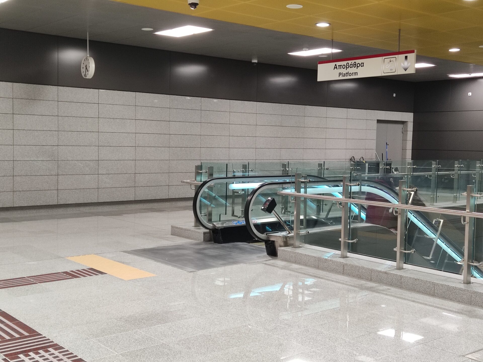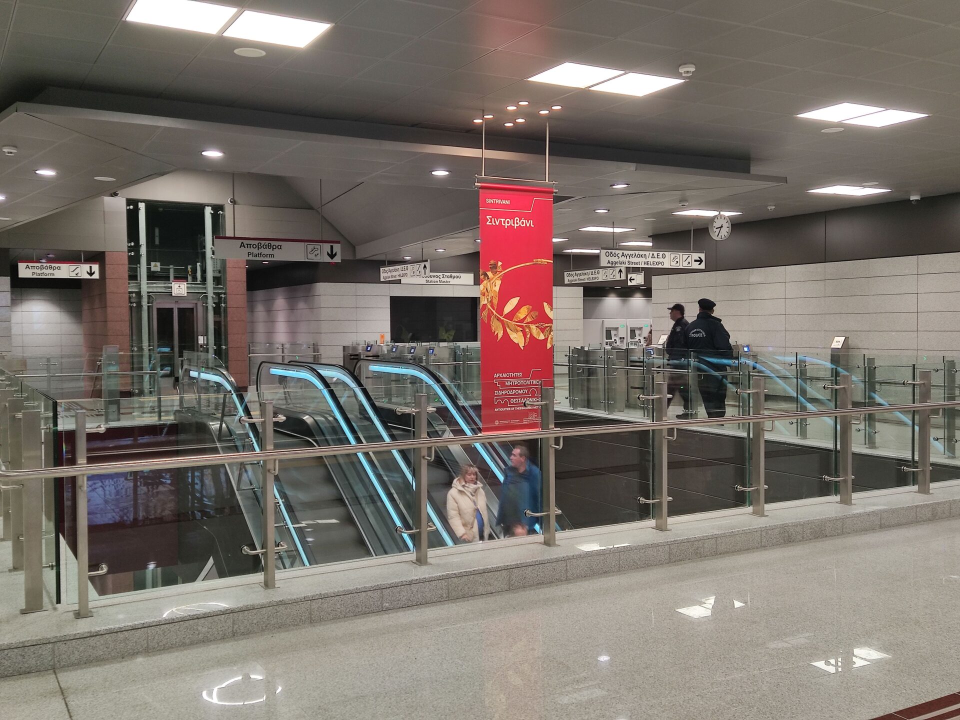 Η αισθητική παρόμοια με αυτήν που θα συναντήσω στους περισσότερους σταθμούς. Κυλιόμενες με λωρίδες φωτισμού στο πλάι, μάρμαρα στο πάτωμα, οδεύσεις τυφλών και μεταλλικά κάγκελα και κουπαστές. Στις αποβάθρες, χάρτες με τη βασική γραμμή και την επέκταση Καλαμαριάς (ωστόσο στις κατευθυντήριες πινακίδες η φράση «προς Μίκρα» κρύφτηκε με άσπρα χαρτόνια), μια σειρά μεταλλικά καθίσματα και, φυσικά, οι μασίφ γυάλινες πόρτες που ανοίγουν μόλις καταφτάνει το τρένο, με τις ενδείξεις «Τροχιά 1» και «Τροχιά 2» από πάνω. Ή όλη αίσθηση μοιάζει πολύ με τους νεότερους σταθμούς στην Αθήνα, με τη διαφορά ότι εδώ έχεις μια ολόκληρη γραμμή «του κουτιού».