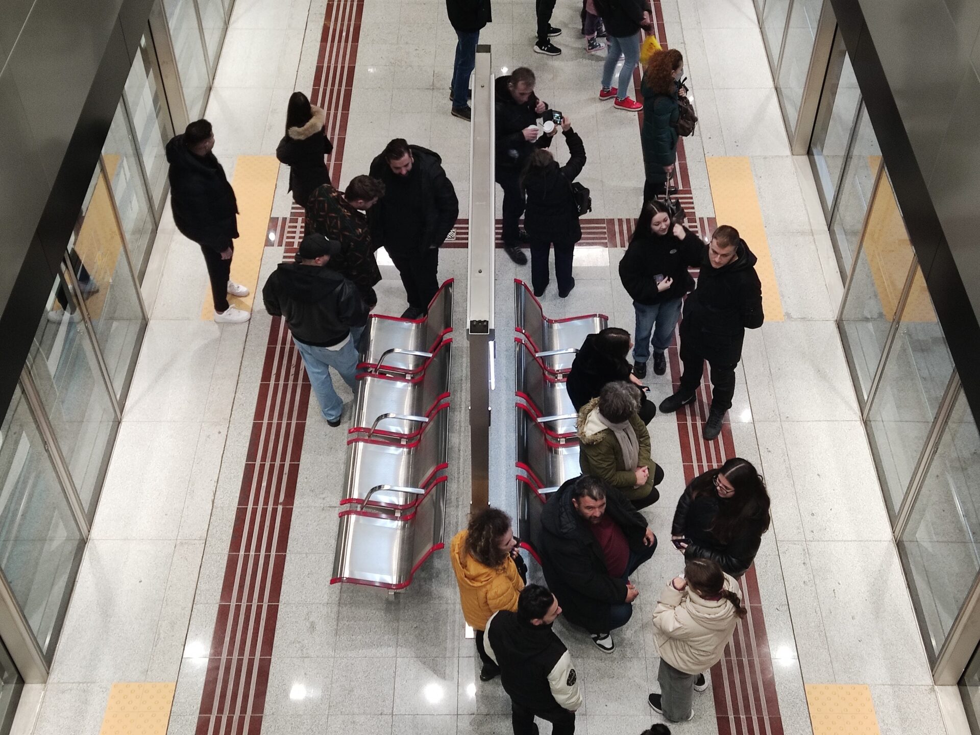 Πλήθη ανθρώπων κατεβαίνουν, αφού βγουν πρώτα φωτογραφίες με την πινακίδα έξω από το σταθμό, όπου δεσπόζει φυσικά και το αμφιλεγόμενο λογότυπο του μετρό. «Στηθείτε να βγείτε μια φωτογραφία και μετά πάμε μέσα, θα πουντιάσετε!», ακούω μια νέα μαμά να λέει στα παιδιά της.