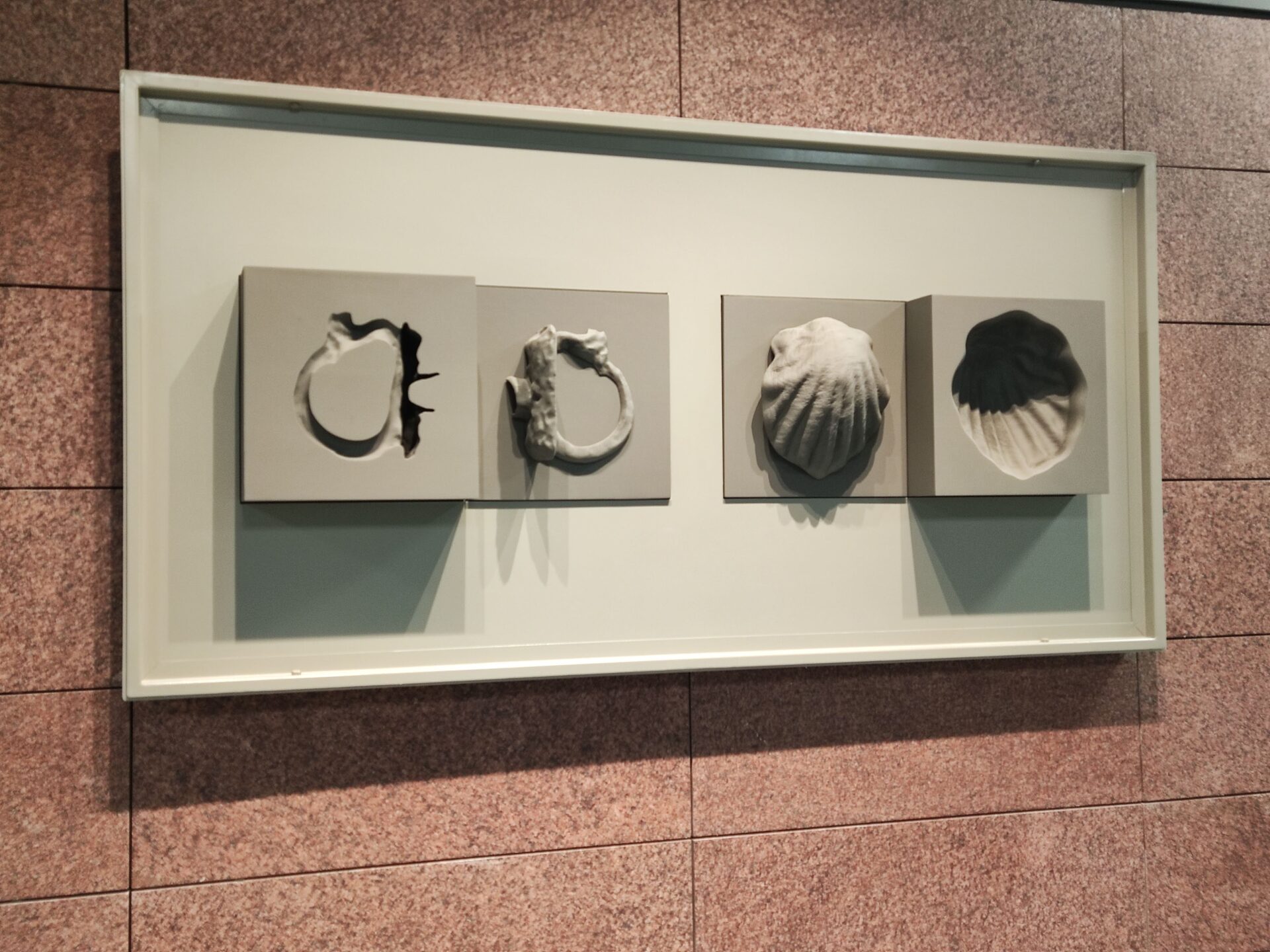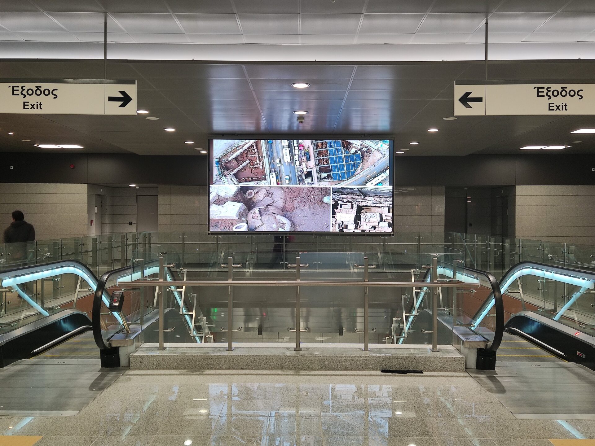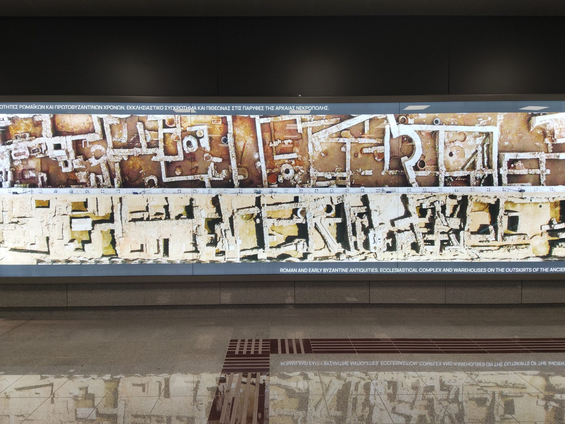Στο σταθμό Σιντριβάνι παρατηρώ τις προθήκες με τις μαρμάρινες λάρνακες και στα κομμάτια ψηφιδωτού από την κοιμητηριακή βασιλική του 400-500 μ.Χ. Δύο άλλοι φίλοι περνάνε λέγοντας: