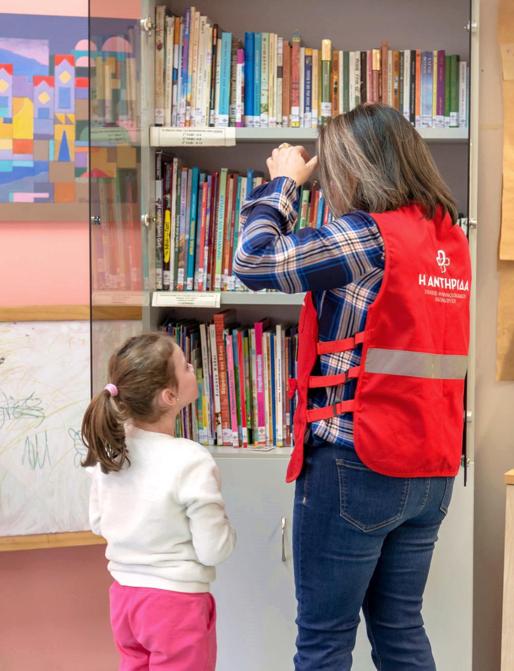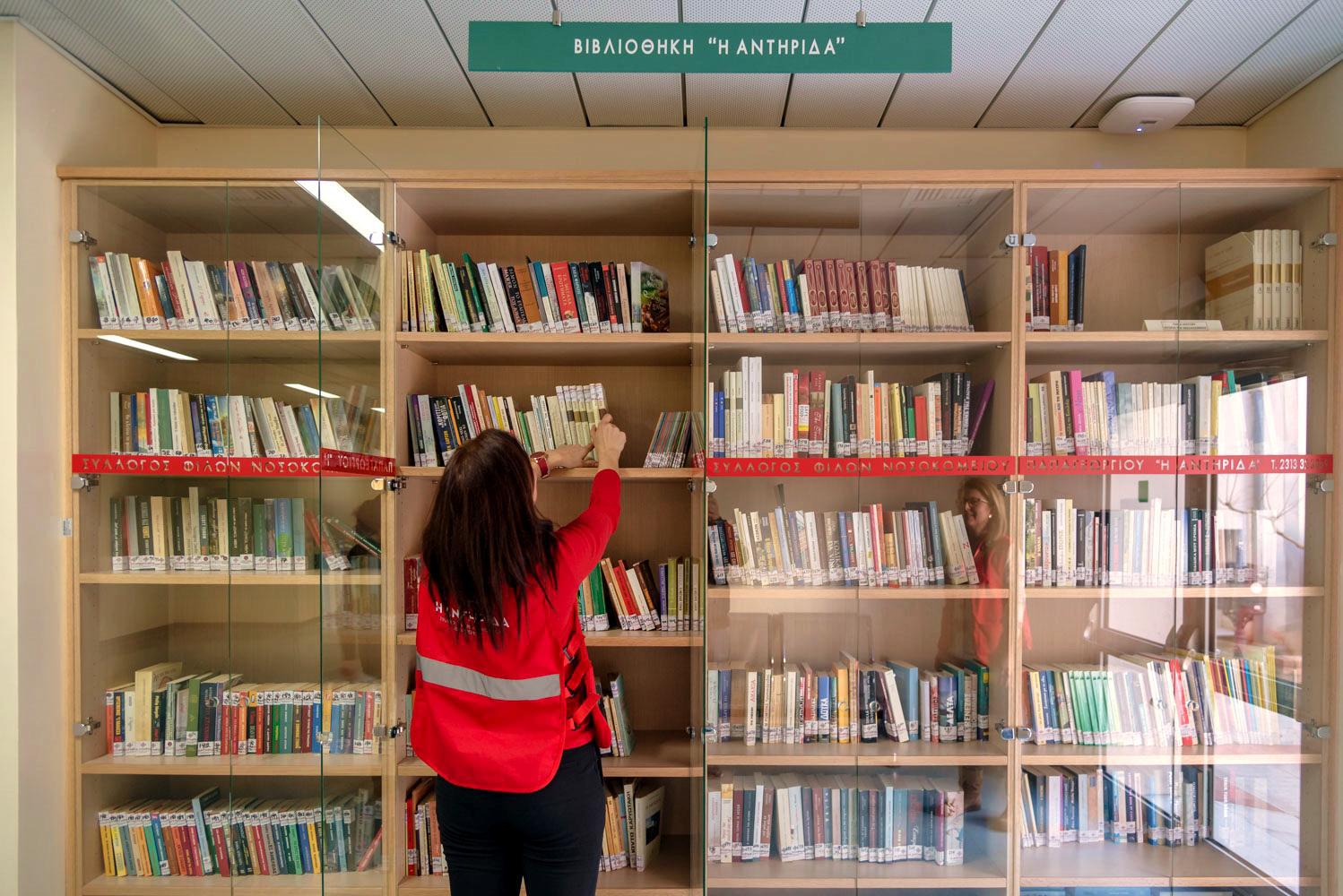 Πρώτος σταθμός, οι βιβλιοθήκες που χειρίζεται η Αντηρίδα, καθώς διαθέτει Δανειστική, Κινητή και Ανταλλακτική Βιβλιοθήκη, με ό,τι περιλαμβάνει η φροντίδα τους, από παραλαβή δωρεών βιβλίων, άμεση καταγραφή, διαλογή και τακτοποίησή τους, μέχρι επίσκεψη χώρων του νοσοκομείου με την κινητή βιβλιοθήκη και συχνή αναβάθμιση της δανειστικής. Είναι συχνό φαινόμενο άλλωστε να δεις ανθρώπους στα παγκάκια του νοσοκομείου να διαβάζουν ένα βιβλίο, είτε για να περάσουν την ώρα της αναμονής ή ακόμη και για να ξεχαστούν από την ανησυχία τους.