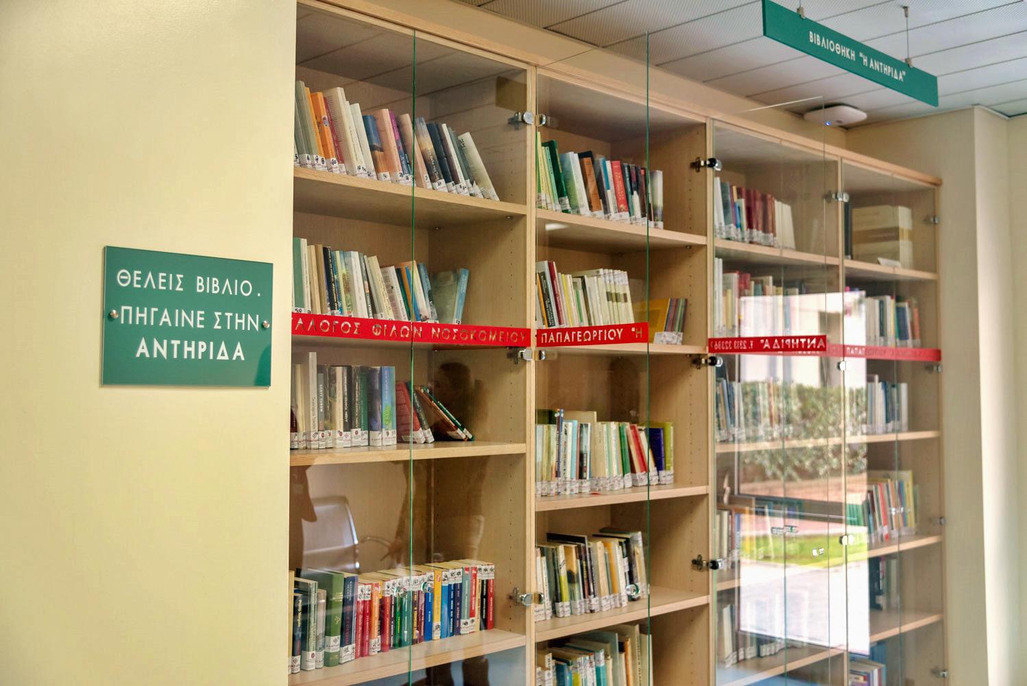 Η Δανειστική Βιβλιοθήκη της Αντηρίδας διαθέτει πάνω από 1500 βιβλία, κάθε ενδιαφέροντος, από λογοτεχνικά και ιστορικά μέχρι θρησκευτικά, τα οποία είναι πλήρως αρχειοθετημένα με σύστημα. Για να προμηθευτεί κάποιος ένα, αρκεί να προσέλθει στο γραφείο της Αντηρίδας και να ζητήσει να του ανοίξουν την βιβλιοθήκη, ενώ σημειώνονται τα στοιχεία του δανειστή και ο αριθμός του βιβλίου όπως ακριβώς σε μια κανονική βιβλιοθήκη. Και φυσικά είναι αρκετά τα σημεία του νοσοκομείου όπου τα σταντ εφοδιάζονται με βιβλία και περιοδικά.