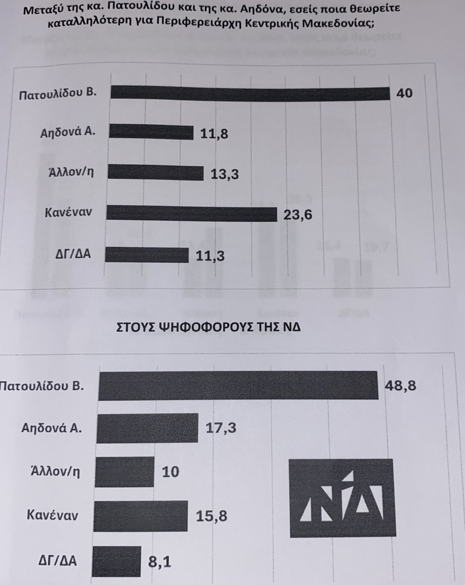 Σε ψηφοφόρους της Νέας Δημοκρατίας επίσης το 48,8% απάντησε πως προτιμά την κ, Πατουλίδου, το 17,3% την κ. Αηδονά, «άλλον» το 10%, «κανέναν» το 15,8% και «δεν ξέρω, δεν απαντώ» το 8,1.