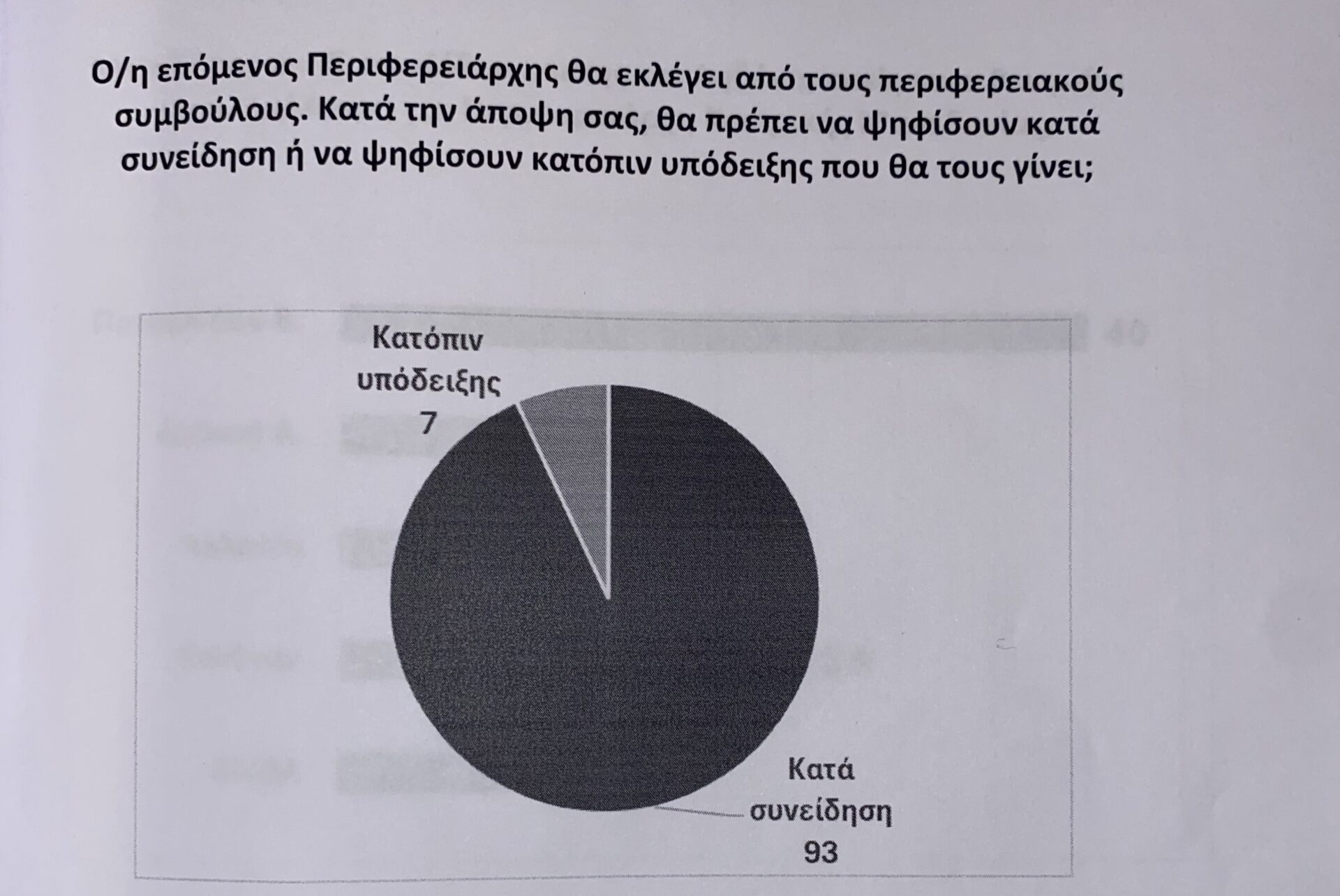 Στην ερώτηση αν θα πρέπει οι περιφερειακοί σύμβουλοι να ψηφίσουν κατά συνείδηση ή κατόπιν υπόδειξης, το 93% ψήφισε το «κατά συνείδηση», ενώ στα χαρακτηριστικά που πρέπει να έχει ο νέος Περιφερειάρχης, οι πρώτες απαντήσεις ήταν: