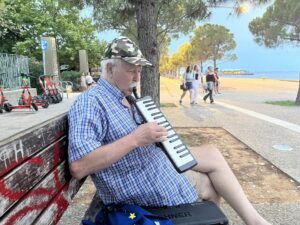 Έφτασα μέχρι τον όμιλο φίλων θαλάσσης, κι’ αυτό γιατί αιφνιδίως έπιασα τον εαυτό μου να σιγοτραγουδάει το «Σίδερα μασάει ο κουταλιανός».. Σταμάτησα και τότε είδα αυτό τον κύριο. Πουκαμισάκι καρέ, τα τρία πρώτα κουμπιά ανοιχτά, έτσι να παίρνει αέρα το στέρνο και στο χέρι μια μελόντικα. Προσηλωμένος στο παίξιμο του, μόνο το λευκό του μουστάκι ξέρει πως αγκάλιαζε το στόμιο της. Μελωδία από άλλη εποχή, Μάνος Λοΐζου, τι να πεις;