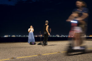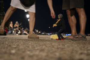 Καθώς συνέχιζα την πορεία μου, το βλέμμα μου έπεσε σε έναν street artist. Η μαριονέτα με το βιολί έμοιαζε να συνοψίζει το νόημα του περιπάτου μου εκείνο το βράδυ. Όπως η μαριονέτα κινούνταν με τη βοήθεια των αόρατων νημάτων του καλλιτέχνη, έτσι και εμείς. Έστω, έτσι και εγώ κινήθηκα μέσα στη πόλη. Επηρεαζόμενος από της αόρατες και μη δυνάμεις της Νέας Παραλίας.