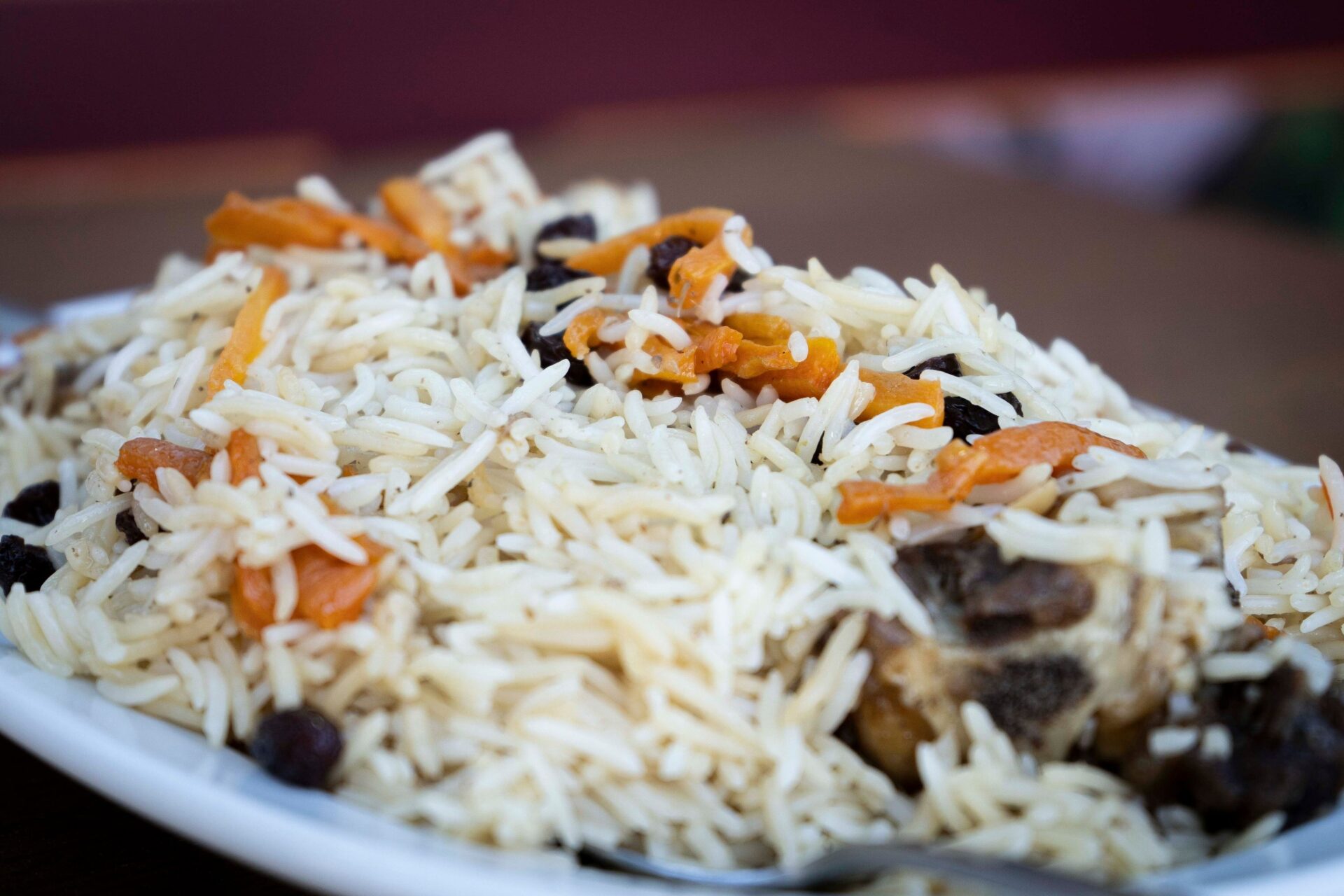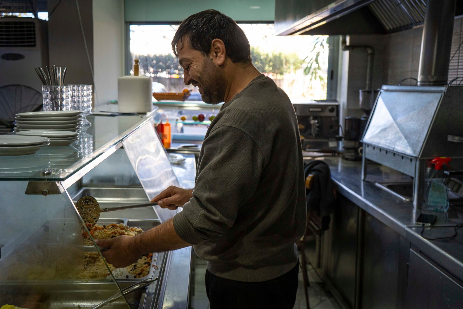 Χαμογελαστός και ευγενικός γεμίζει αμέσως μια μεγάλη πιατέλα με Kabuli, αρωματισμένο ρύζι με αρνί τριμμένο καρότο και σταφίδες για να μας φιλέψει.