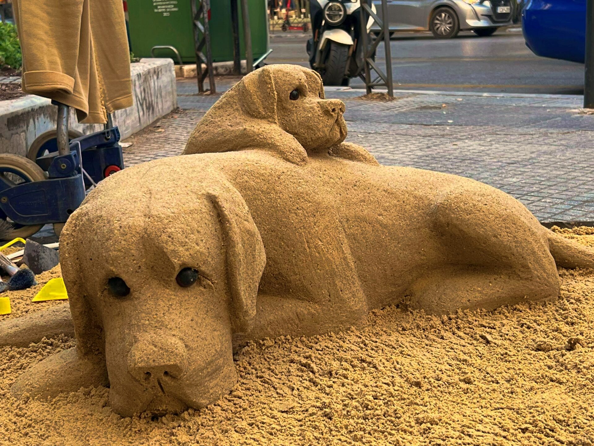 Σήμερα πολλοί περαστικοί έσκυψαν το κεφάλι και έβγαλαν φωτογραφίες τα δύο σκυλιά, που ήταν φτιαγμένα από άμμο.