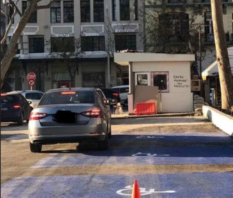 Εκείνη την ώρα, συνέβη ένα μικρό περιστατικό, ενδεικτικό της αντίληψης του Δήμου για τον δημόσιο χώρο: ένα ακριβό αυτοκίνητο παρκάρει καταλαμβάνοντας μέρος από τη μόνη ελεύθερη θέση πάρκινγκ για ΑμεΑ που είχε απομείνει. Ο υπάλληλος του Δήμου συνομιλεί με τον οδηγό και στη συνέχεια παίρνει δυο-τρία παλιά ταμπλό και μια κορίνα του Δήμου για να σκεπάσει το σήμα των αναπήρων, ώστε να μην φαίνεται ότι το αυτοκίνητο παρανομεί. Προφανώς, το μέλος μας φωτογράφισε και τη νέα αυτή «κυκλοφοριακή ρύθμιση».