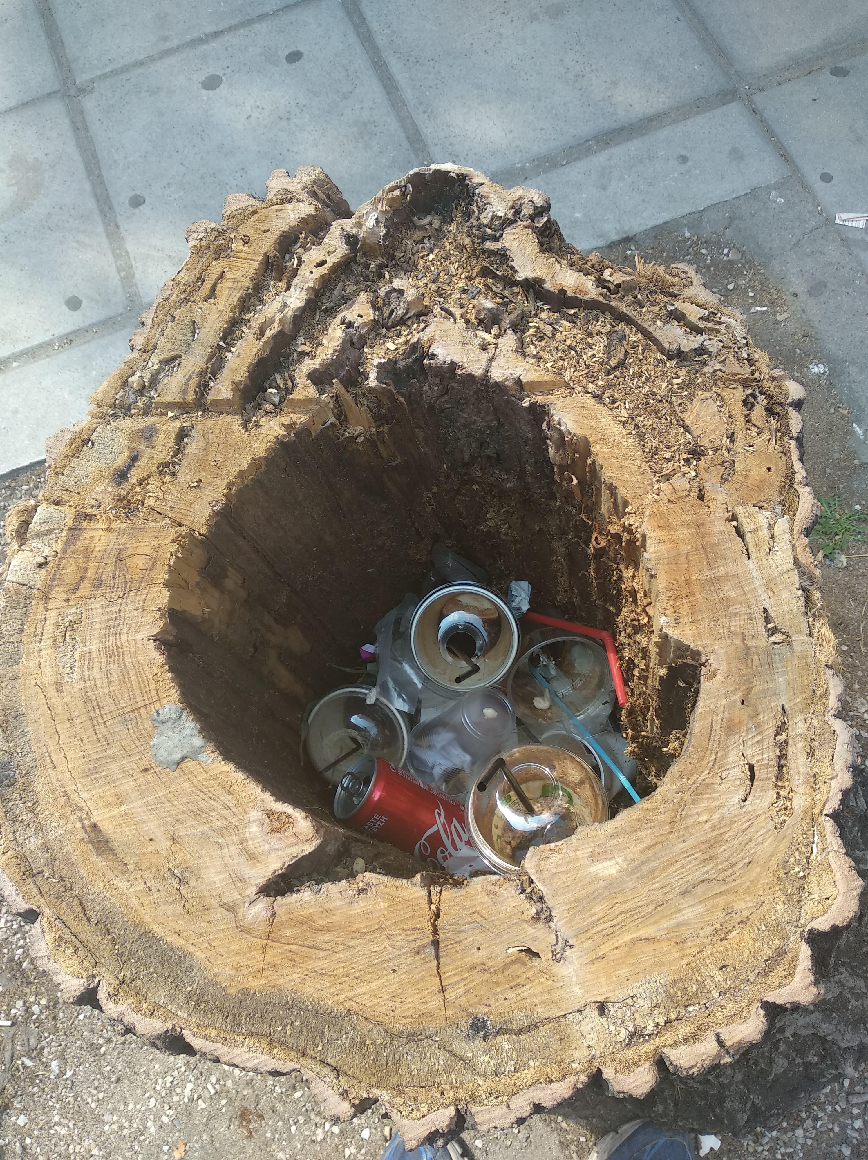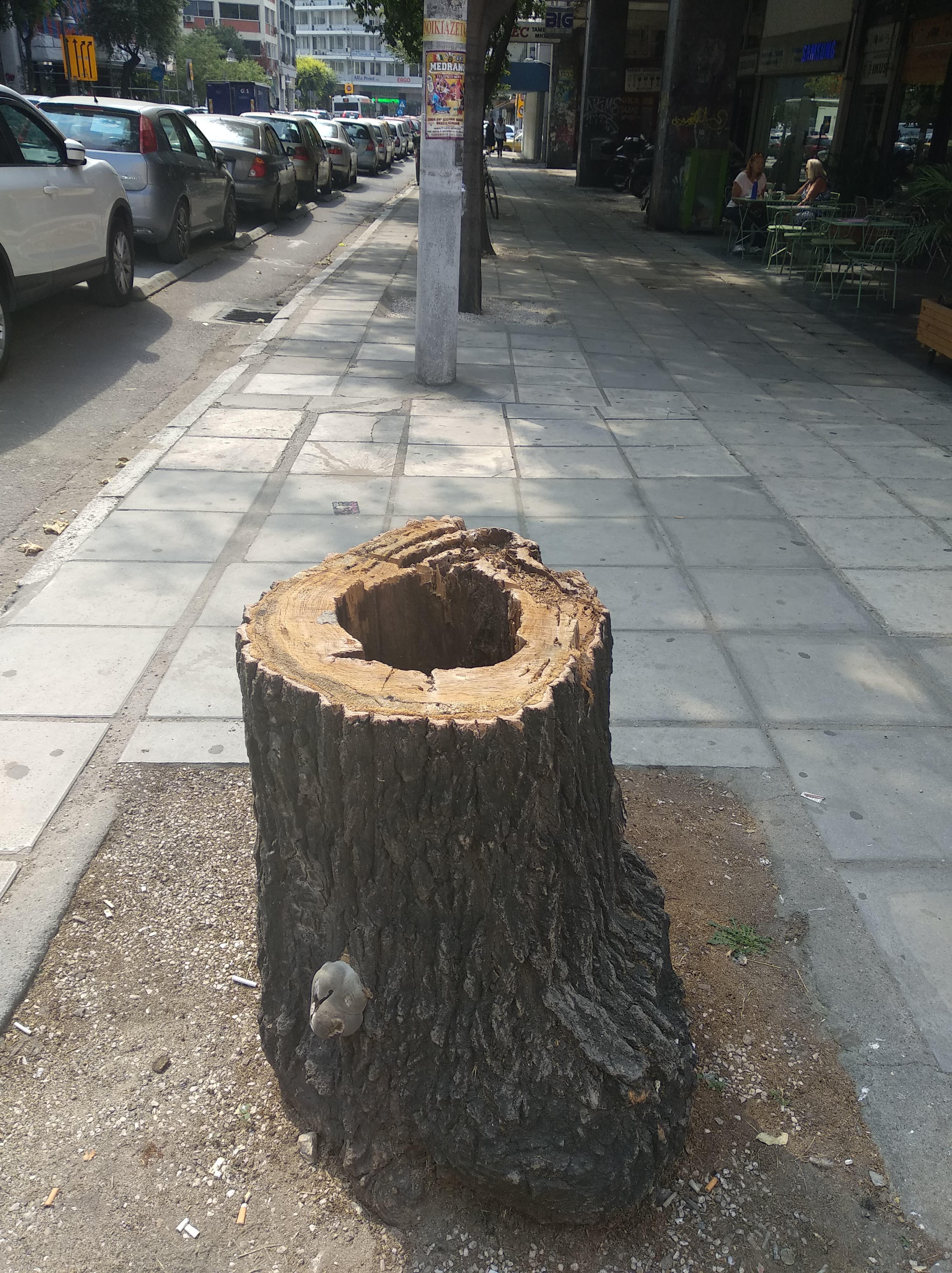 Το δέντρο αυτό βρίσκεται στην οδό Δωδεκανήσου, στη στάση Δημόκριτος. Κομμένο όπως το βλέπετε. Για άγνωστους σε μας λόγους. Έχει απομείνει στο πεζοδρόμιο να θυμίζει τι ήταν κάποτε. Κάποιοι αποφάσισαν να το διακοσμήσουν. Το αποτέλεσμα ενδεικτικό του πολιτισμού της πόλης.