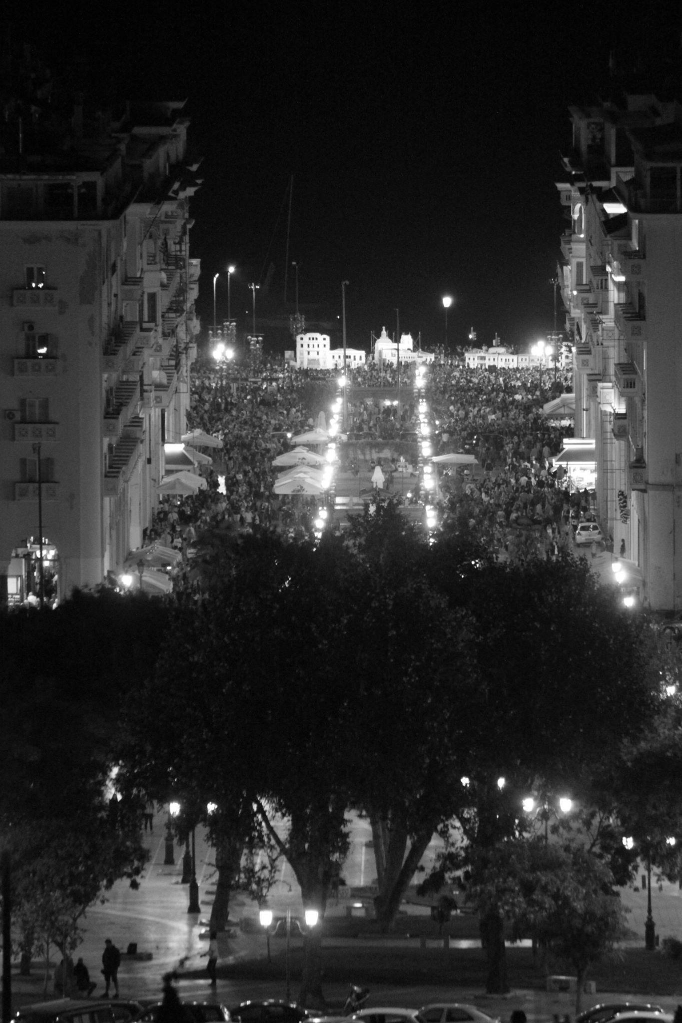 Λίγο μετά τις 8 το βράδυ ο κόσμος που συγκεντρώθηκε στην Πλατεία Εμπορίου ξεκίνησε να κατευθύνεται προς την πεζοδρομημένη παραλιακή Λεωφόρο Νίκης. Εκεί ενώθηκε με εκείνους που είχαν περάσει μία βόλτα από τα Βοροινά, στο Λιμάνι Θεσσαλονίκης, όπως μπορούσε να μυρίσει κανείς και στην ατμόσφαιρα, με τα διάχυτα αρώματα του κρασιού. Σαν όλη η πόλη να είχε συγκεντρωθεί σε έναν δρόμο, σαν να μην είχε μείνει κανείς σπίτι του…