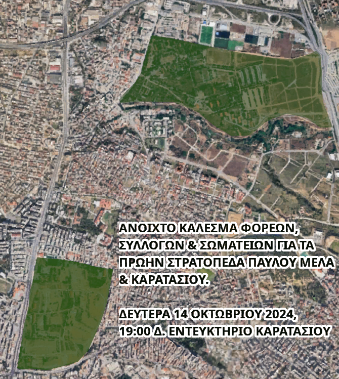 Φορείς, σύλλογοι και σωματεία, καλούν τους πολίτες να παραστούν το απόγευμα της Δευτέρας 14 Οκτωβρίου, στο Δημοτικό εντευκτήριο του πρώην Στρατοπέδου Καρατάσιου, ώστε να συζητηθεί το μέλλον των δύο πρώην στρατοπέδων Παύλου Μελά και να σχεδιάσουν, από κοινού τα επόμενα αγωνιστικά βήματα.