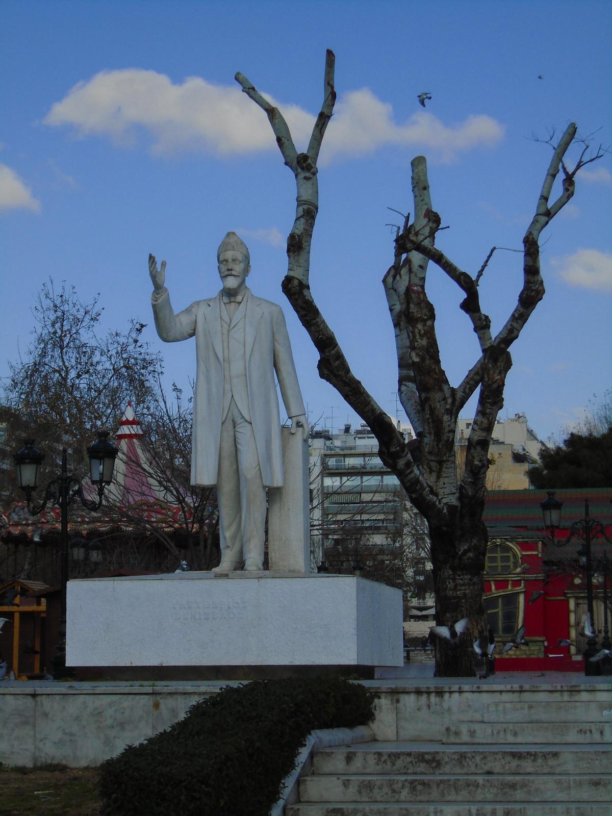 Αγαλμα Εθνάρχου προ του πρόσφατου γλυπτού επί βανδαλισμένου ζώντος δέντρου (τού καημένου…) και φόντο στημένο κοντρακεδένιο σαλετάκι (περιμένει το Πάσχα ή τις επόμενες γιορτές;) Κατακαημένε Βενιζέλε…