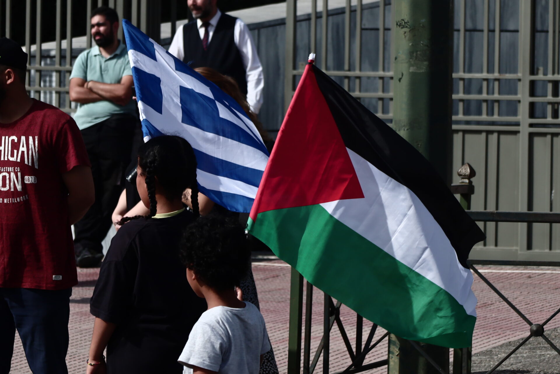 «Αγωνιζόμαστε για την ειρήνη των λαών. Για τερματισμό της ισραηλινής κατοχής. Για Παλαιστίνη ελεύθερη στα σύνορα του 1967 με πρωτεύουσα την Ανατολική Ιερουσαλήμ» ακούγεται από τα μεγάφωνα της συγκέντρωσης.