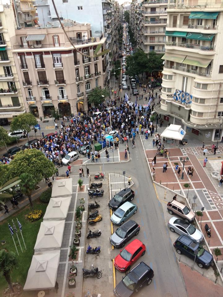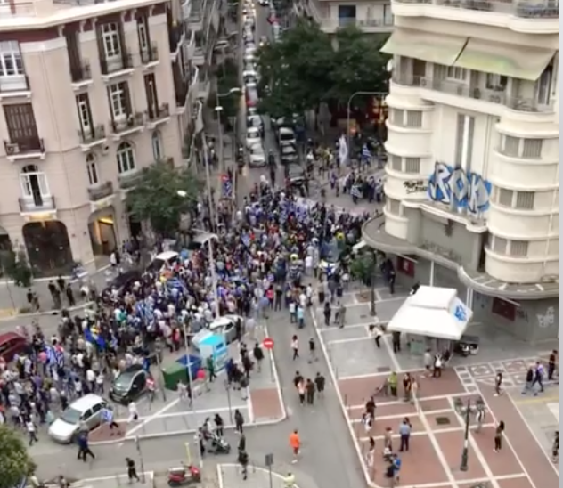 Οι διαδηλωτές κρατούν ελληνικές σημαίες και φωνάζουν συνθήματα για την ελληνικότητα της Μακεδονίας και κατά των πολιτικών με κυρίαρχο το Αλήτες, Προδότες, Πολιτικοί παράλληλα τραγουδούν το Μακεδονία Ξακουστή.