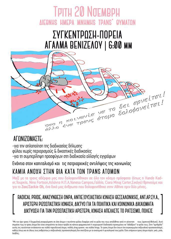 Συγκέντρωση διαμαρτυρίας και πορεία θα πραγματοποιηθεί σήμερα Τρίτη 20 Νοεμβρίου, στο κέντρο της πόλης από οκτώ οργανώσεις/συλλογικότητες της Θεσσαλονίκης για τη Διεθνή Ημέρα Μνήμης Τρανς Θυμάτων. Η συγκέντρωση έχει προγραμματιστεί στις 18:00 στο Άγαλμα Βενιζέλου.