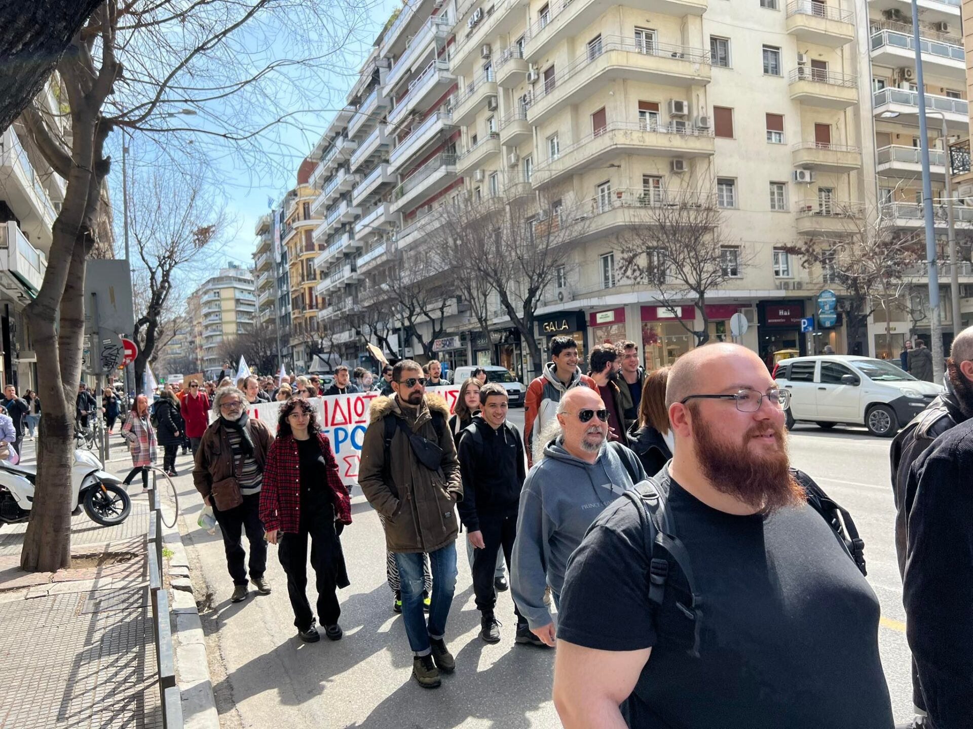 Οι συγκεντρωμένοι κινούνται επί της Τσιμισκή, έχοντας κλείσει ένα από τα ρεύματα κυκλοφορίας και όπως φαίνεται θα καταλήξουν στο ΥΜΑΘ.