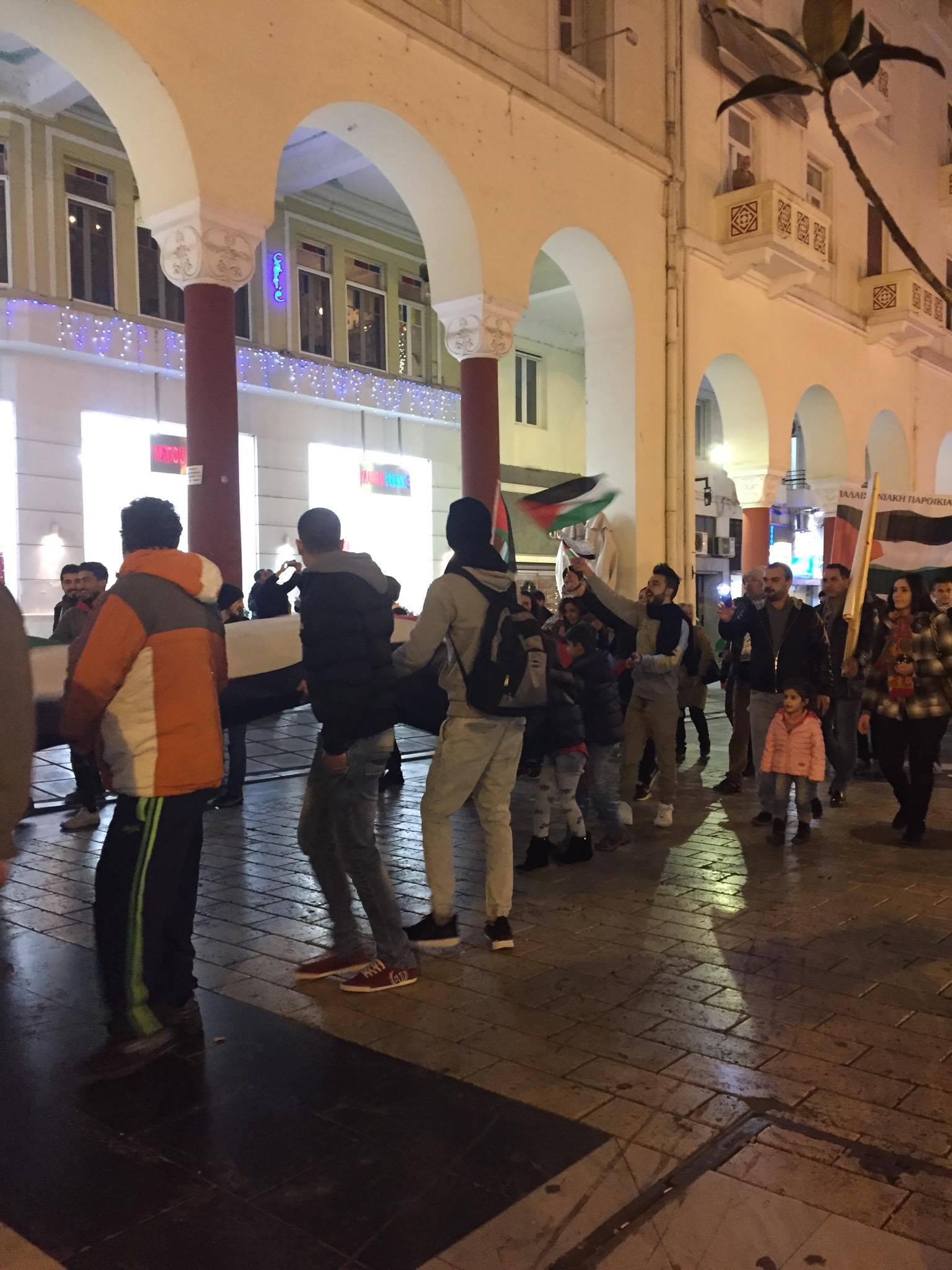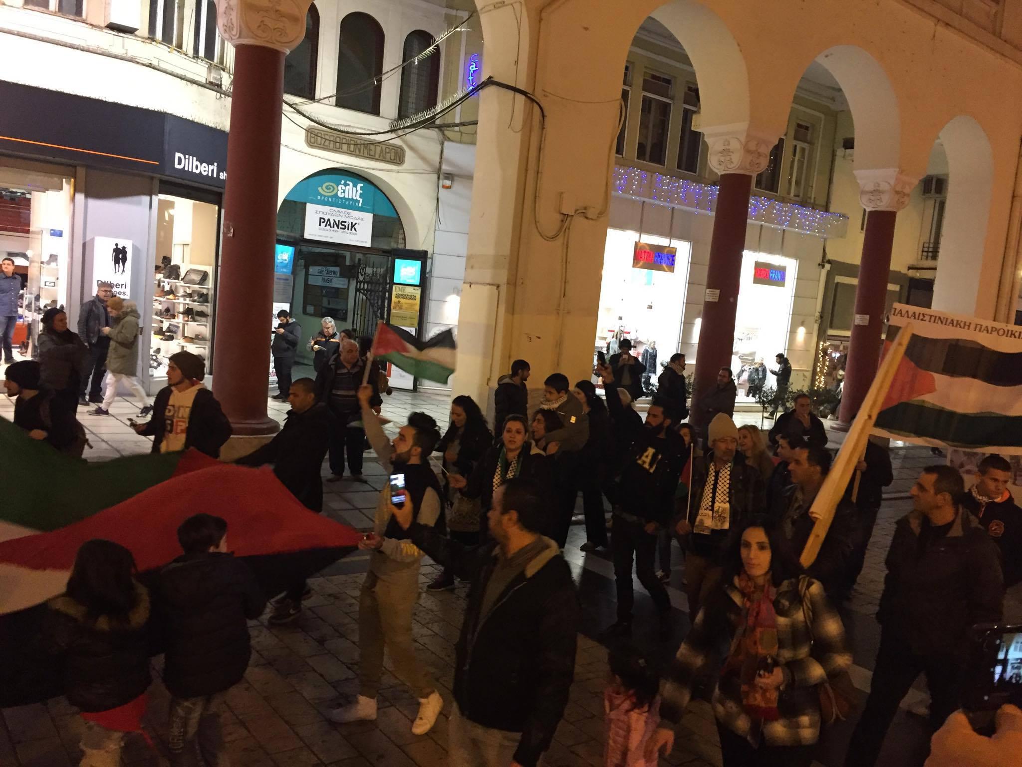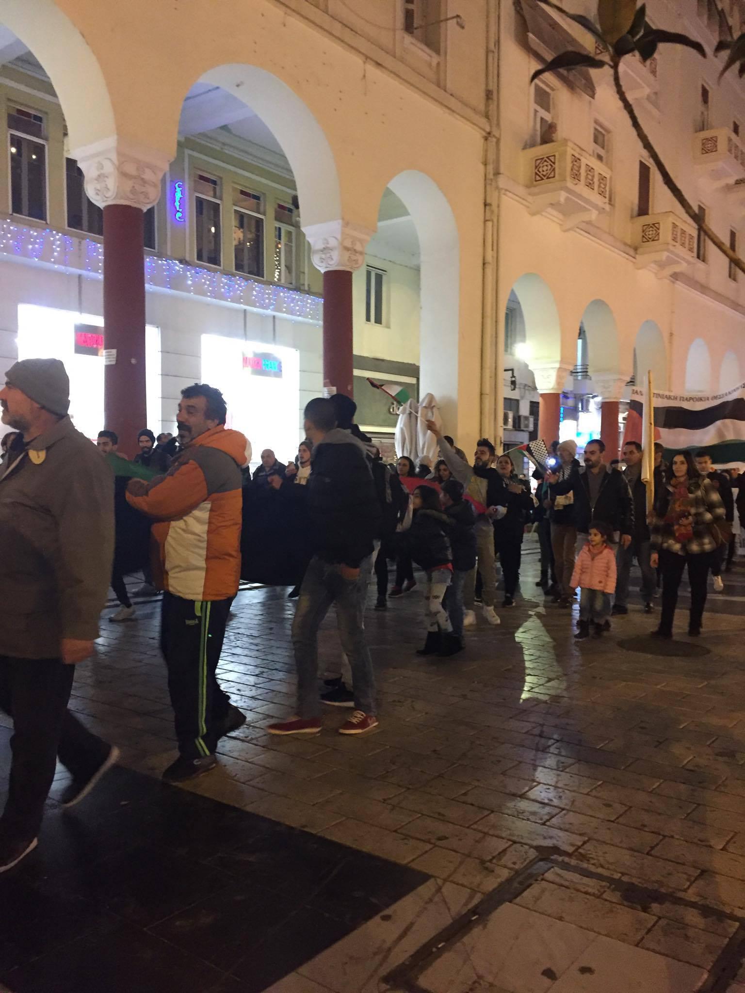 Πορεία βρίσκεται σε εξέλιξη αυτή την ώρα στην πόλη από μέλη της Παλαιστινιακής Παροικίας Θεσσαλονίκης και μέλη της Επιτροπής για την Διεθνή Ύφεση και Ειρήνη Θεσσαλονίκης (ΕΔΥΕΘ).