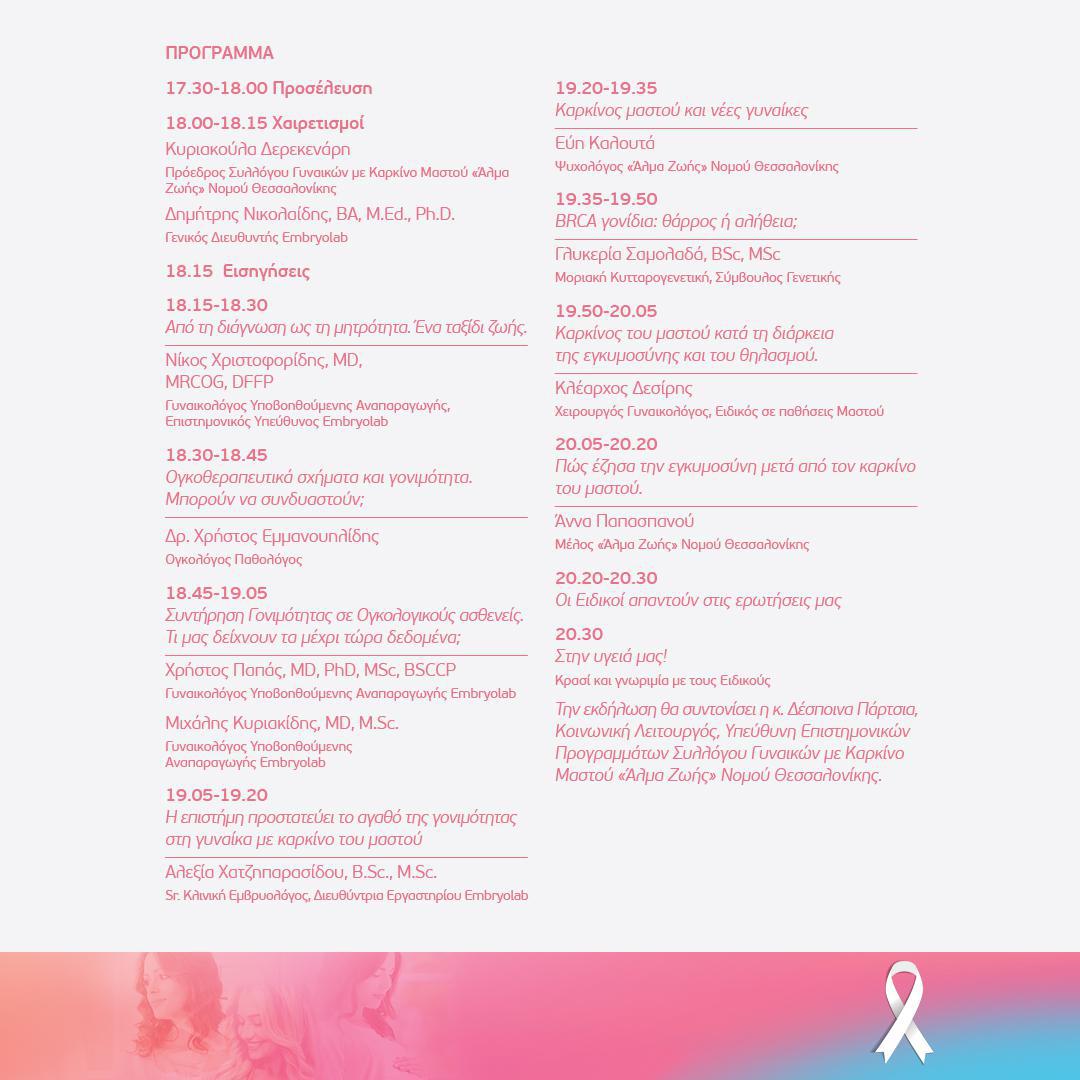 **Ο Σύλλογος Γυναικών με Καρκίνο Μαστού Ν.Θεσσαλονίκης «Άλμα Ζωής» σε συνεργασία με την πρότυπη Μονάδα Ιατρικώς Υποβοηθούμενης Αναπαραγωγής Embryolab διοργανώνουν εκδήλωση ενημέρωσης κοινού με θέμα «Γυναίκες με καρκίνο μαστού. Διεκδικούμε το δικαίωμα στη γονιμότητα! Διεκδικούμε το δικαίωμα στη ζωή»! Η εκδήλωση θα πραγματοποιηθεί την Τετάρτη 26/9/18 και ώρα 18.00 στο ξενοδοχείο Makedonia Palace. Το πρόγραμμα της εκδήλωσης περιλαμβάνει ενδιαφέρουσες ομιλίες, από διακεκριμένους επιστήμονες, σχετικά με το πως η επιστήμη προστατεύει το δικαίωμα στη μητρότητα για τις γυναίκες με καρκίνο του μαστού, από τη συντήρηση της γονιμότητας τους και την επίτευξη εγκυμοσύνης, την κύηση και μέχρι το θηλασμό. Για περισσότερες πληροφορίες μπορείτε να επικοινωνήσετε: Άλμα Ζωής, Δέσποινα Πάρτσια, Κοινωνική Λειτουργός, 2310 285181, Embryolab. Βάσω Πετρίδου, 2310 474747.