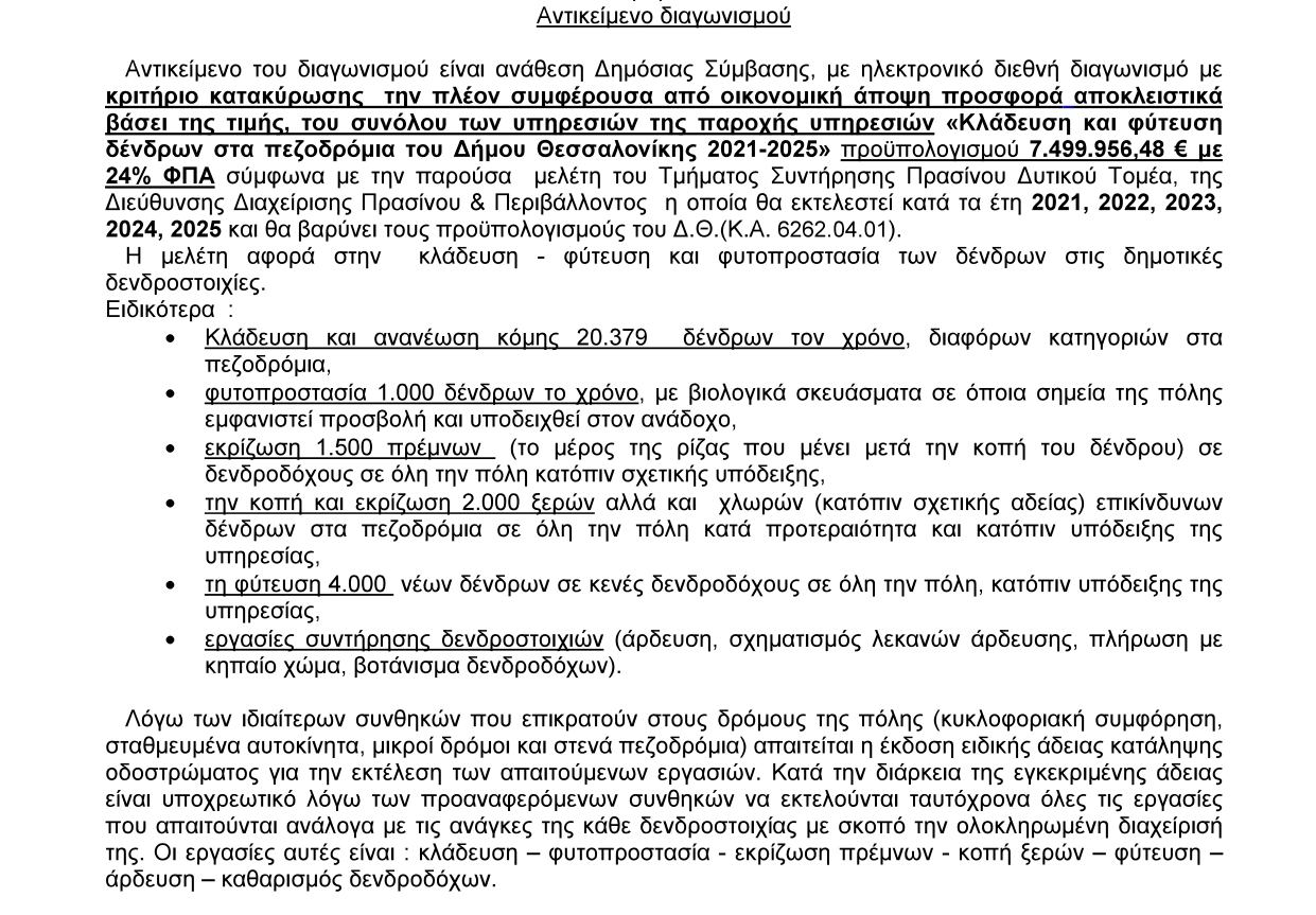 ΔΔΠΠ: Τα δέντρα αποτελούν έμβια όντα που απαιτούν συγκεκριμένες συνθήκες διαβίωσης. Αντιθέτως οι μεγαλουπόλεις αποτελούν ένα εχθρικό περιβάλλον για την ανάπτυξη βλάστησης. Σε αυτό το περιβάλλον τα δέντρα δεν αναπτύσσονται απρόσκοπτα όπως στο φυσικό τους οικοσύστημα π.χ. το δάσος. Ένα δέντρο στην τυπική μορφή του είναι ευθυτενές, κατακόρυφο, κυλινδρικό τουλάχιστον σε τμήματα του κορμού και με κυκλική διατομή. Εξαιτίας όμως του αφιλόξενου αστικού περιβάλλοντος, πολλά από τα δέντρα που φύονται στην πόλη, ιδίως στα πεζοδρόμια, λόγω των ιδιαίτερων σκληρών συνθηκών που επικρατούν (π.χ. πεζοδρόμια μικρού πλάτους, περιορισμένος αυξητικός χώρος, συμπιεσμένα εδάφη με κακό αερισμό και μειωμένο πορώδες, διέλευση εναέριων και υπόγειων δικτύων οργανισμών κοινής ωφέλειας που εμποδίζουν την ανάπτυξη της κόμης και του ριζικού συστήματος κ.τ.λ.), αυτά εμφανίζουν μεγάλες αποκλίσεις από την τυπική μορφή τους καθώς και δομικά σφάλματα όπως μεγάλες σπηλαιώσεις, εκτεταμένη σήψη και σαθρότητα στον κορμό και τη βάση, έντονη κλίση, κάμψη και στρεβλότητα του κορμού, διχαλώσεις, επιφανειακό και «επιπόλαιο» ριζικό σύστημα, ραγάδες, καύση κορμού, αλλά και εμφανείς μυκητολογικές («μανιτάρια» και μαύρο μεταχρωματισμό του φλοιού) καθώς και εντομολογικές προσβολές. Τα συγκεκριμένα ευρήματα επηρεάζουν τη στατικότητα και τη μηχανική αντοχή των δέντρων, καθιστώντας τα άκρως επικίνδυνα. Συνεπώς τα δέντρα με την προαναφερόμενη ακανόνιστη δομή, δεν αποτελούν σε καμία περίπτωση «αισθητικά στοιχεία (αρχιτεκτονήματα)» αλλά πηγές άμεσου κίνδυνου αναφορικά με τραυματισμούς πολιτών καθώς και φθορά ιδιοκτησιών και υποδομών. Άρα επιβάλλεται κλάδεμα με σκοπό την ασφάλεια των πολιτών για την προστασία της περιουσίας τους και φυσικά την υγεία των δέντρων, σε περιπτώσεις όπως: Σε δέντρα που αναπτύσσουν «επιπόλαιο» επιφανειακό ριζικό σύστημα όπως οι λεύκες, στις οποίες διαχρονικά έχουν καταγραφεί σοβαρά προβλήματα ευστάθειας. Σε παρασιτικά/επεκτατικά είδη όπως οι αείλανθοι. Σε πολύ γερασμένα δέντρα που παρουσιάζουν εξωτερικές σήψεις όπως οι ψευδακακίες. Σε δέντρα με σήψεις οι οποίες δεν είναι εμφανείς μακροσκοπικά αλλά διαπιστώνονται στο εσωτερικό του δέντρου κατά τη διάρκεια του κλαδέματος. Για άρση επικινδυνότητας σε δέντρα στα οποία κόπηκαν ρίζες στο πλαίσιο κάποιου έργου π.χ. αποκατάστασης πλακών πεζοδρομίων, ώστε να εξισορροπηθεί η υπέργεια βλάστηση με τη ρίζα. Σε δέντρα που φύονται σε μικρά πεζοδρόμια με πενιχρό αυξητικό χώρο τα οποία «γειτονεύουν» και «εμποδίζουν» τη χρήση φωτιστικών σωμάτων, μπαλκονιών κ.ο.κ., καθώς και τη διέλευση πεζών. Σε καρποφόρα δέντρα όπως π.χ. μουριές που λερώνουν ή προκαλούν ολισθηρότητα με τους καρπούς τους στα πεζοδρόμια. Σε δέντρα που φύονται πλησίον φωτεινών σηματοδοτών, ρυθμιστικών ή πληροφοριακών πινακίδων, υπέργειων δικτύων εταιρειών κοινής ωφέλειας, αλλά και δρόμων με αυξημένη κυκλοφορία λεωφορείων και γενικότερα οχημάτων. Γενικά σε δέντρα που παρουσιάζουν απόκλιση από την τυπική μορφή, σφάλματα δομής, καθώς και ανισορροπία/μονόπλευρη ανάπτυξη της κόμης.