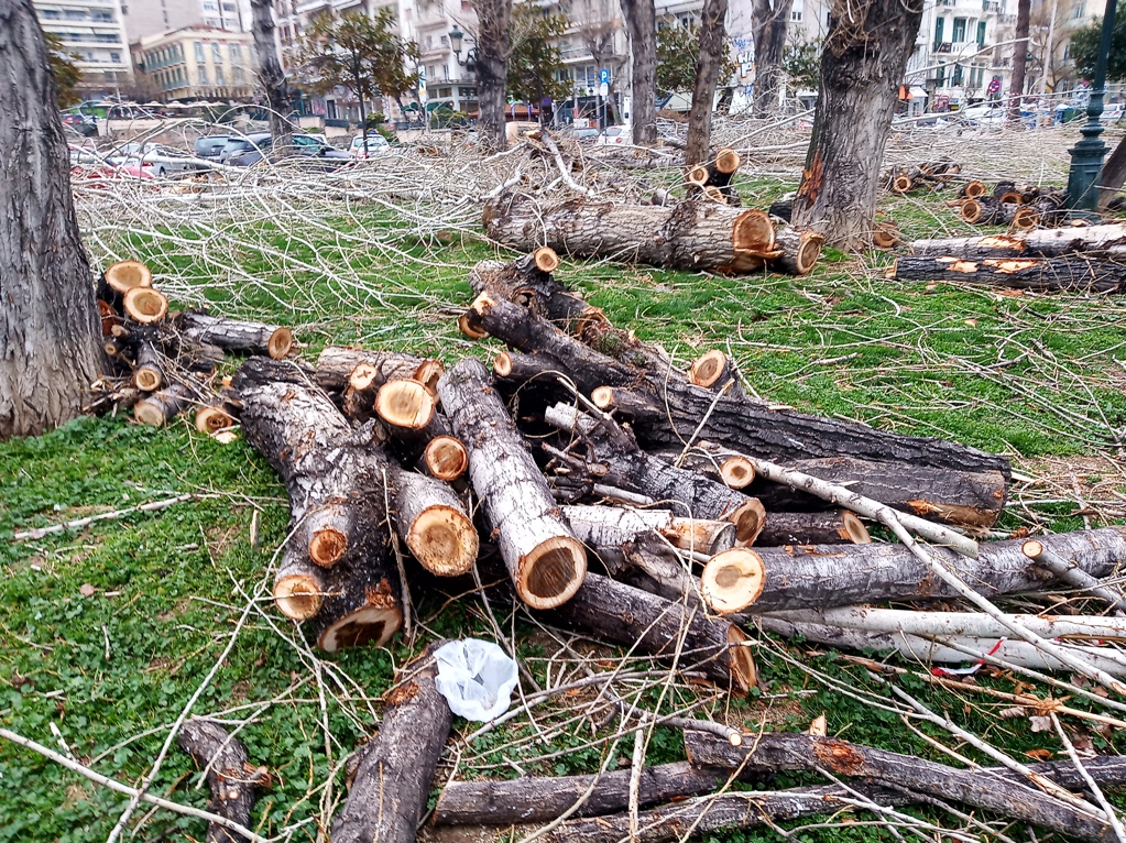 Σε ότι αφορά τις συμβάσεις για την κοπή των δένδρων, αναφέρει ότι «αντί ο δήμος να διεκδικήσει πόρους από ευρωπαικά προγράμματα για την αναβάθμιση του πράσινου της πόλης στο πλαίσιο της αντιμετώπισης της κλιματικής αλλαγής, επιλέγουν να ξοδεύουν τα χρήματα των δημοτών για τις συγκεκριμένες κοπές των δένδρων. Αυτά πέρασαν στον προϋπολογισμό του δήμου και αφορούν την κοπή 4000 δένδρων, τις κλαδεύσεις και τις φυτεύσεις στις άδειες δενδροδόχους». Είναι εντυπωσιακό ότι στη μελέτη η σφαγή που επιχειρείται χαρακτηρίζεται ανανέωση…