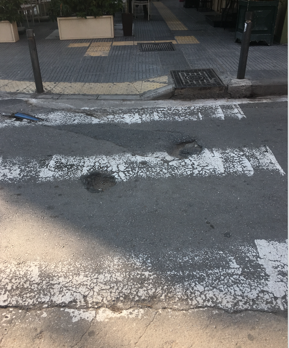Στη γωνία Π. Π. Γερμανού, Παλαιολόγου και Σβώλου η εικόνα που τιμά καθόλου την πόλη είναι αυτή. Αυτές οι μαύρες τρύπες στο οδόστρωμα, ικανές να καταπιούν φτέρνες, αστραγάλους και την αξιοπρέπεια της Θεσσαλονίκης παραμένουν έτσι για μήνες. Κάθε μέρα κόσμος και κοσμάκης, πεζός, με ποδήλατα, με μηχανάκια ή με παιδικά καρότσια πέφτει εντός του.