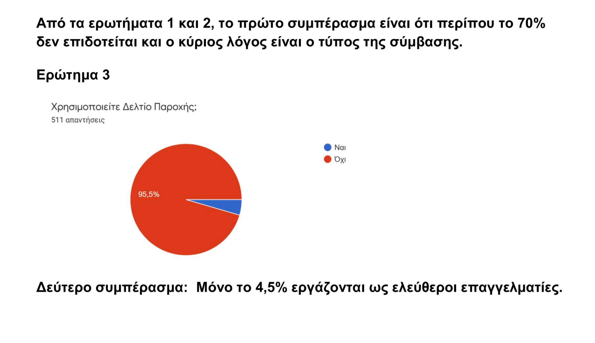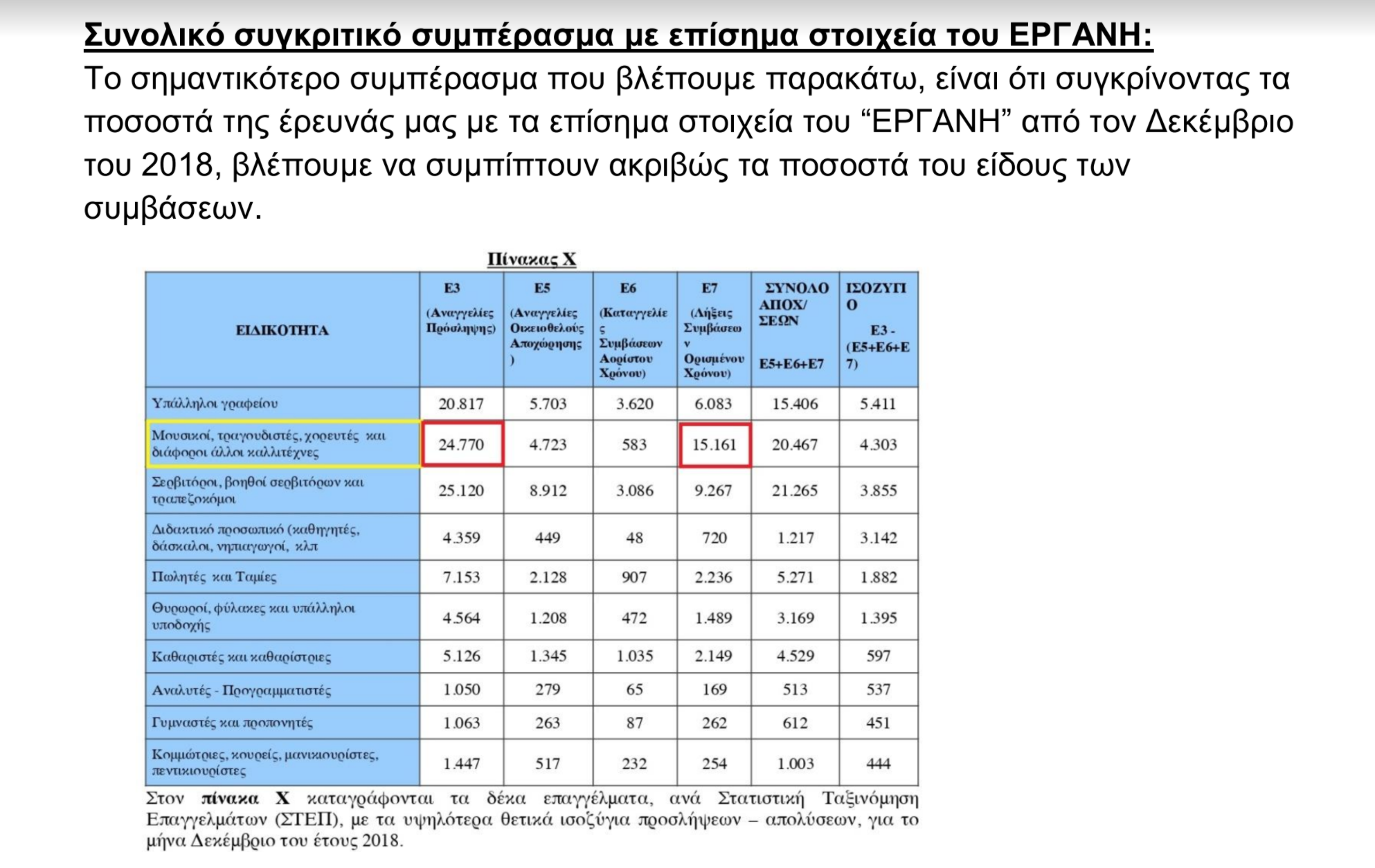 Σύμφωνα με τον πίνακα σε σύνολο 24770 συμβάσεων, οι ορισμένου χρόνου συμβάσεις που λήγουν είναι 15161, άρα το 61,2%. Το ποσοστό αυτό, με πολύ μικρή παρέκκλιση είναι το ίδιο με αυτό που εξαγάγει η έρευνα του Σ.Μ.Β.Ε. Αυτό μας οδηγεί και στα συμπεράσματα της κεφαλίδας του κειμένου.