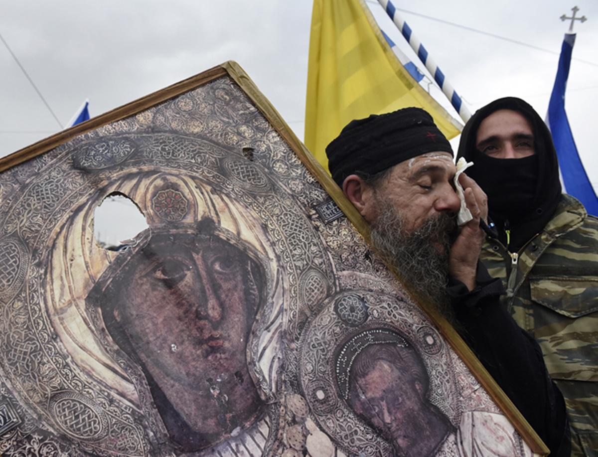 Αλέξανδρος Αβραμίδης Μοναχός που κρατάει εικόνα της Παναγίας σκουπίζει τα μάτια του από τα δακρυγόνα που έριξε η Aστυνομία σε διαμαρτυρία για τη Συμφωνία των Πρεσπών στην Αθήνα (20 Ιανουαρίου 2019)