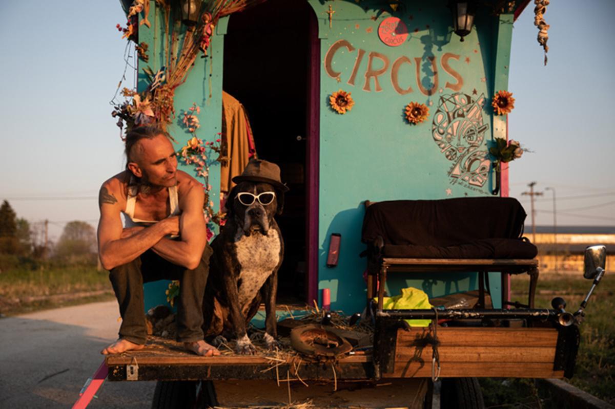 Λευτέρης Παρτσαλής Περφόρμερ από το καραβάνι Ambulans Théâtre, που ξεκίνησε από τη Γαλλία με προορισμό το Πλοβντίβ της Βουλγαρίας, κάθεται στο βαγόνι του κατά τη διάρκεια στάσης έξω από τα Τρίκαλα (24 Μαρτίου 2019)