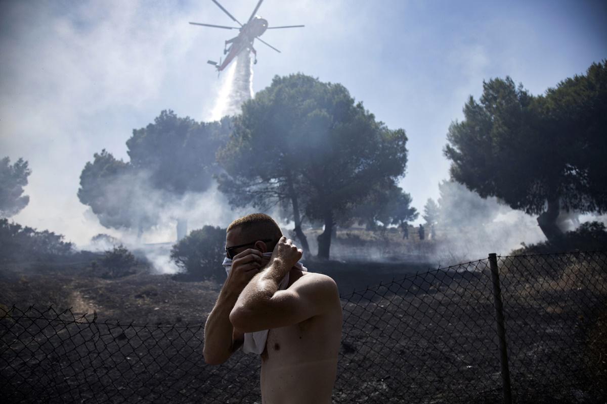 Γιώργος Καραχάλης Κάτοικος προσπαθεί να βοηθήσει στην κατάσβεση μεγάλης δασικής πυρκαγιάς στην Εύβοια (13 Αυγούστου 2019)
