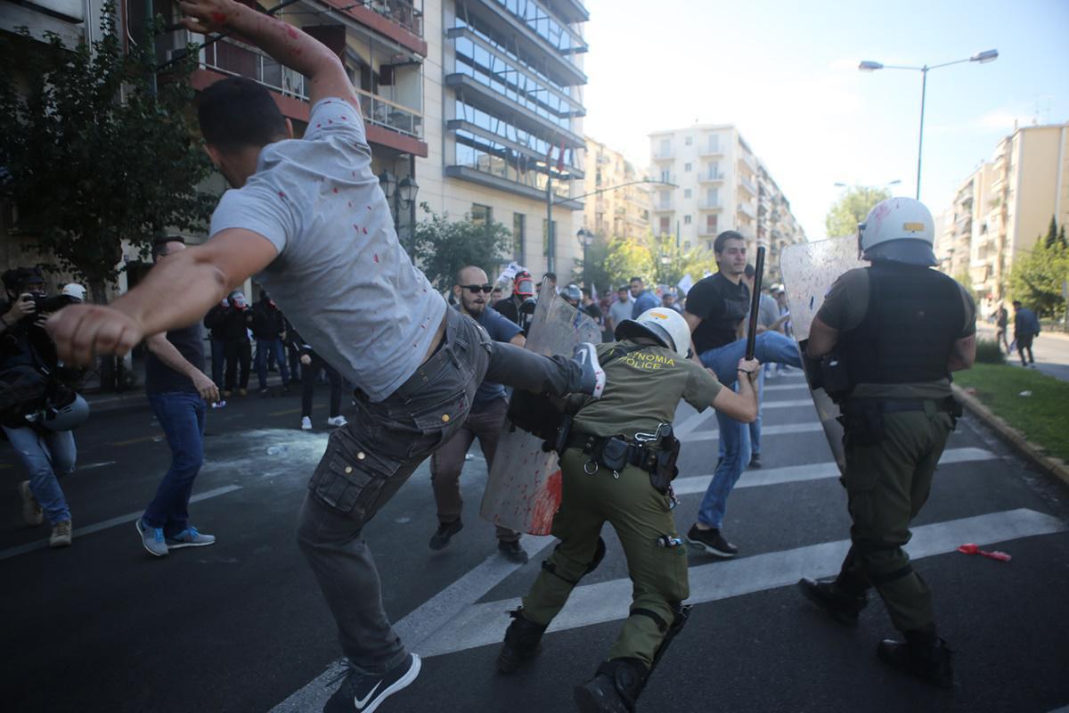 Δημήτρης Καπάνταης Διαδηλωτής απωθεί άνδρα των ΜAT σε επεισόδια που έγιναν στην Αθήνα με αφορμή την επίσκεψη του Αμερικανού υπουργού Εξωτερικών Μάικ Πομπέο (5 Οκτωβρίου 2019)