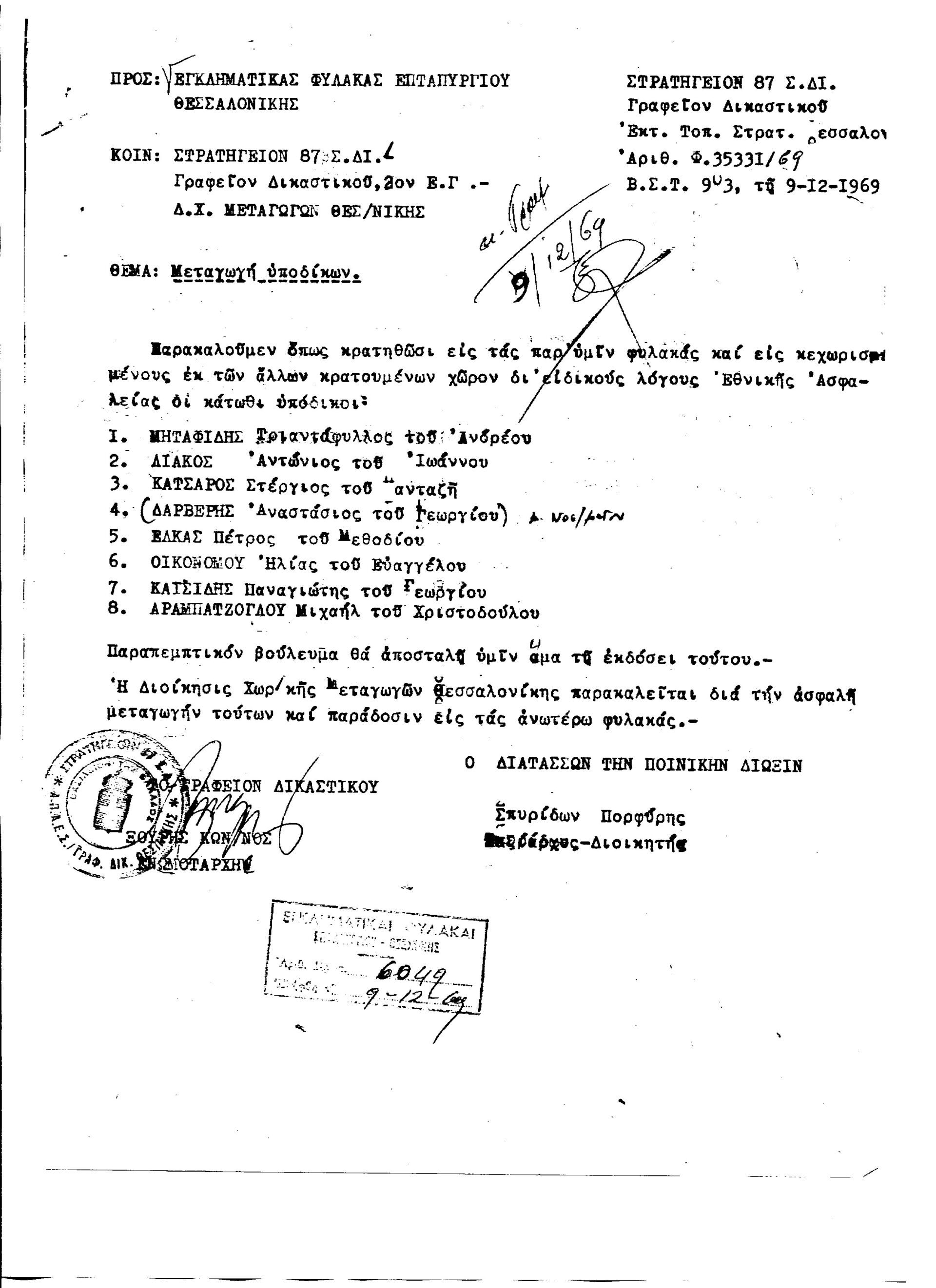 […] Άρχισε να γίνεται φανερό σ’ όλους μας, όμως, ότι οι συνθήκες κράτησης στο τμήμα Μεταγωγών θα μας αρρώσταιναν. Αποφασίσαμε να ζητήσουμε τις τη μεταγωγή μας στις φυλακές. Κάναμε κάποια διαβήματα στο διοικητή του τμήματος που με τη σειρά του πίεζε τους ανωτέρους του, αφού και ο ίδιος ήθελε να ξεφορτωθεί την ευθύνη της περιφρούρησης μας. Δεν μας έδιναν σημασία. Αποφασίσαμε να κάνουμε απεργία πείνας. Πριν όμως το ανακοινώσουμε στο διοικητή ενημερώσαμε τους ξένους ανταποκριτές κι έτσι τη στιγμή που εμείς ανακοινώναμε την απόφασή μας στο διοικητή, κάποιες εφημερίδες στην Ευρώπη δημοσίευσαν την είδηση. Τελικά τον Νοέμβρη (σ.σ. 9 Δεκεμβρίου ήταν), μεταφερθήκαμε στις φυλακές Επταπυργίου».