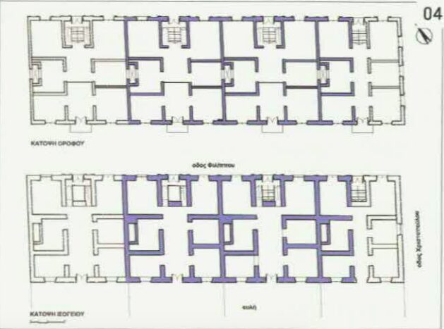 […] Οι εκτεταμένες μετατροπές στον όροφο οδήγησαν και στην αλλαγή της στέγης. Καταργήθηκαν οι φωταγωγοί μεταξύ των κατοικιών (με εξαίρεση αυτόν μεταξύ 3ης και 4ης κατοικίας που διατηρείται) και οι ενδιάμεσοι τοίχοι πυροπροστασίας. Η νέα στέγη διατηρείται μέχρι σήμερα, έχει την ίδια γεωμετρία με την παλιά με τη διαφορά ότι πρόκειται για μια ενιαία κατασκευή. Στο ισόγειο χωροθετούνται τα κρατητήρια. Γίνεται αναδιάταξη του χώρου με τη διάνοιξη εσωτερικών διαδρόμων κατά την επιμήκη διάσταση του κτιρίου. Κατεδαφίζονται τμήματα των εγκάρσιων φερουσών τοχοποιιών, ενώ παράλληλα οικοδομούνται νέες που εξυπηρετούν τη νέα χρήση. Στο δυτικό άκρο του κτηρίου χωροθετείται το κυρίως κρατητήριο και ακολουθεί το κυλικείο. Αυτοί οι χώροι έχουν πρόσβαση απ’ ευθείας από την αυλή. Πίσω τους διατάσσονται δευτερεύοντες βοηθητικοί χώροι, όπως αποθήκη, πλυντήριο, αποχωρητήριο. Πιο ανατολικά, στη θέση του επιμήκους προθαλάμου της δεύτερης κατοικίας, έχουμε την κατακόρυφη επικοινωνία με τον όροφο.