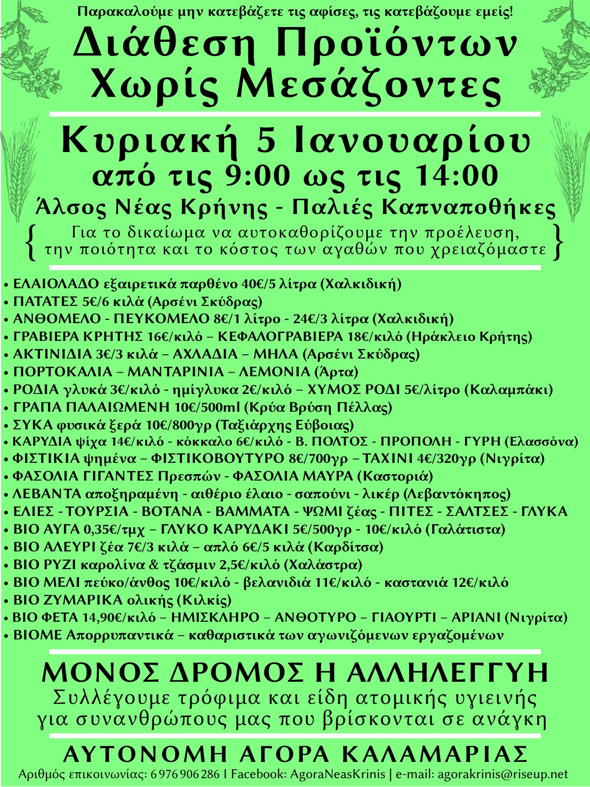 Η διάθεση προϊόντων χωρίς μεσάζοντες θα πραγματοποιηθεί στη Θεσσαλονίκη, την Κυριακή 5 Ιανουαρίου, από τις 9:00 έως τις 14:00 από την Αυτόνομη Αγορά Καλαμαριάς, στο Άλσος της Νέας Κρήνης – Παλιές Καπναποθήκες.