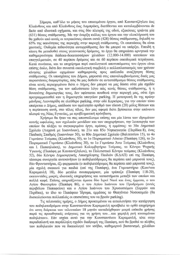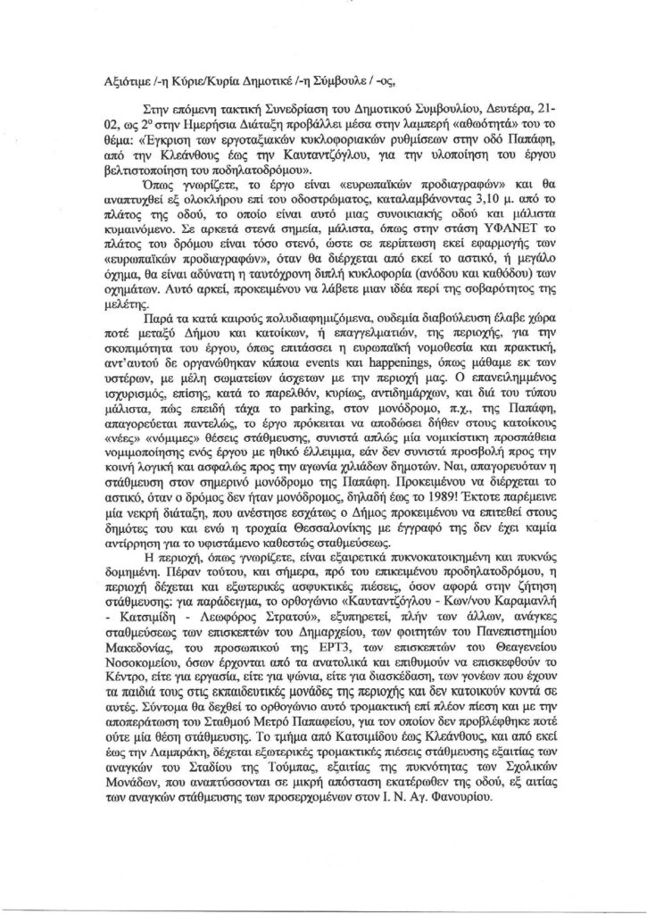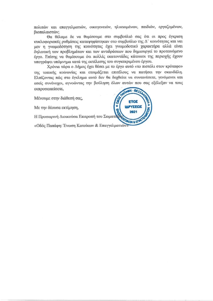 Επίσης οι κάτοικοι της Παπάφη, πριν την συνεδρίαση του δημοτικού συμβουλίου, είχαν αποστείλει ανοιχτή επιστολή σε όλα τα μέλη του Δ.Σ του δήμου Θεσσαλονίκης, εξηγώντας τους λόγους της αντίθεση τους στο έργο του ποδηλατοδρόμου: