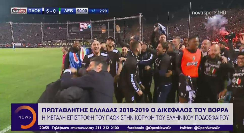 Ο Δικέφαλος του Βορρά είναι πια ο πρωταθλητής Ελλάδος 2018 – 2019, μετά από 34 χρόνια, μια νίκη που σφραγίστηκε με τα γκολ των Σάκχοφ (2), Μπίσεσβαρ, Βαρέλα και Σβιντέρσκι.
