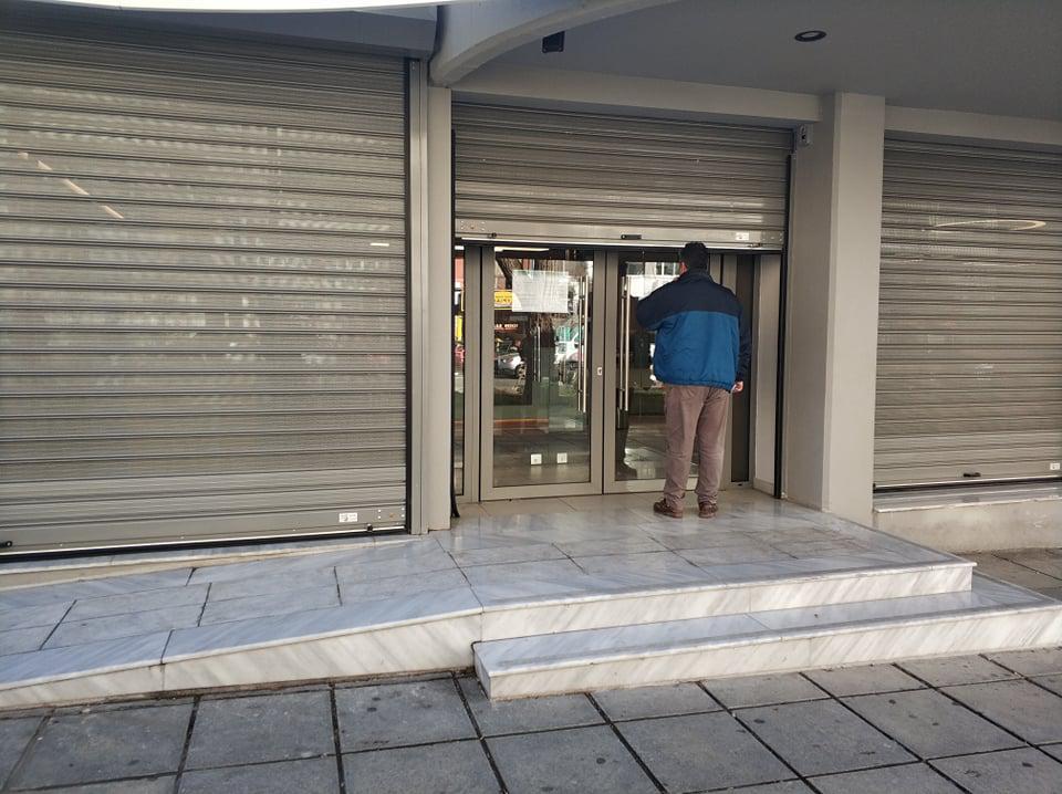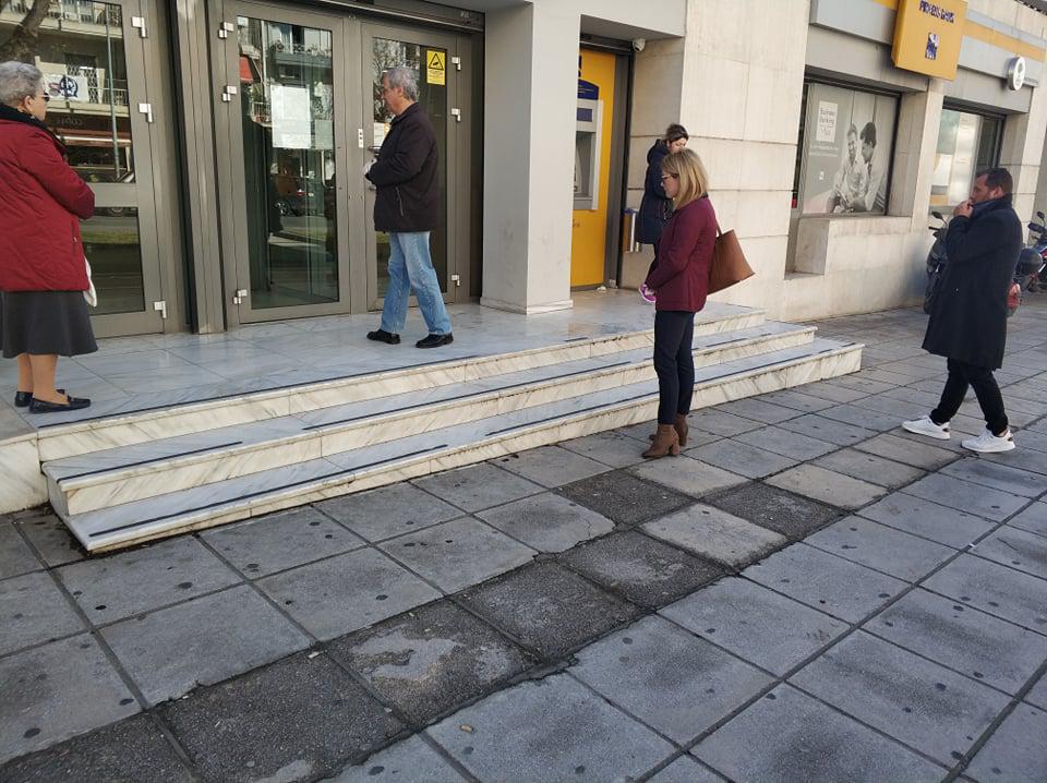 Οι πόρτες κλειστές στο υποκατάστημα, όλοι περιμένουν έξω κρατώντας απόσταση ασφαλείας και μπαίνει ένας η δύο με το που βγαίνει ο προηγούμενος.