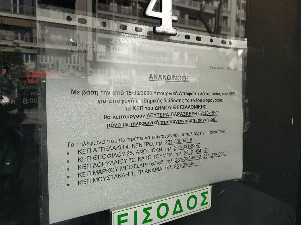 Κλειστές πόρτες στα ΚΕΠ, υπάλληλοι με μάσκα ενημερώνουν για τα τηλέφωνα.