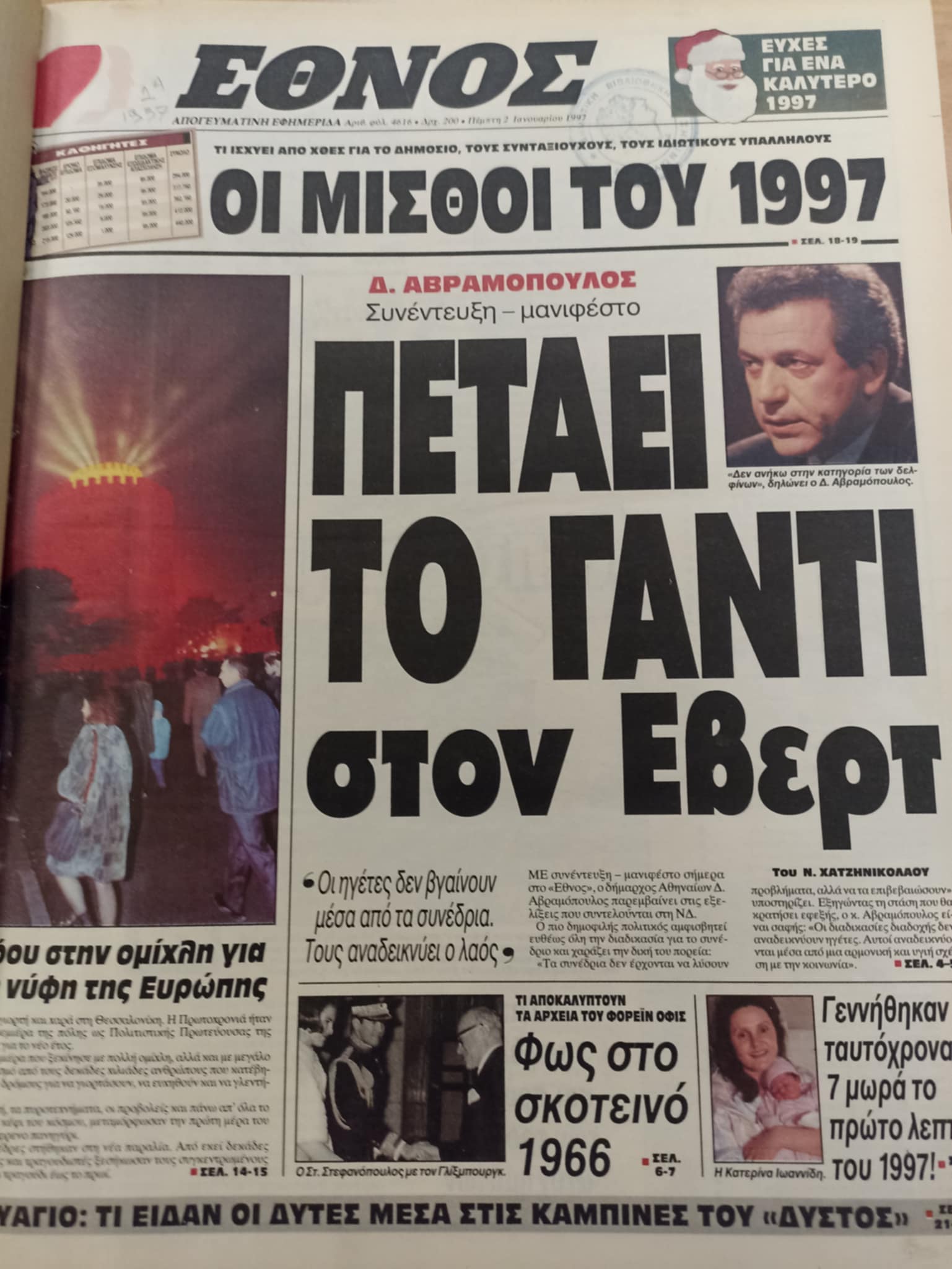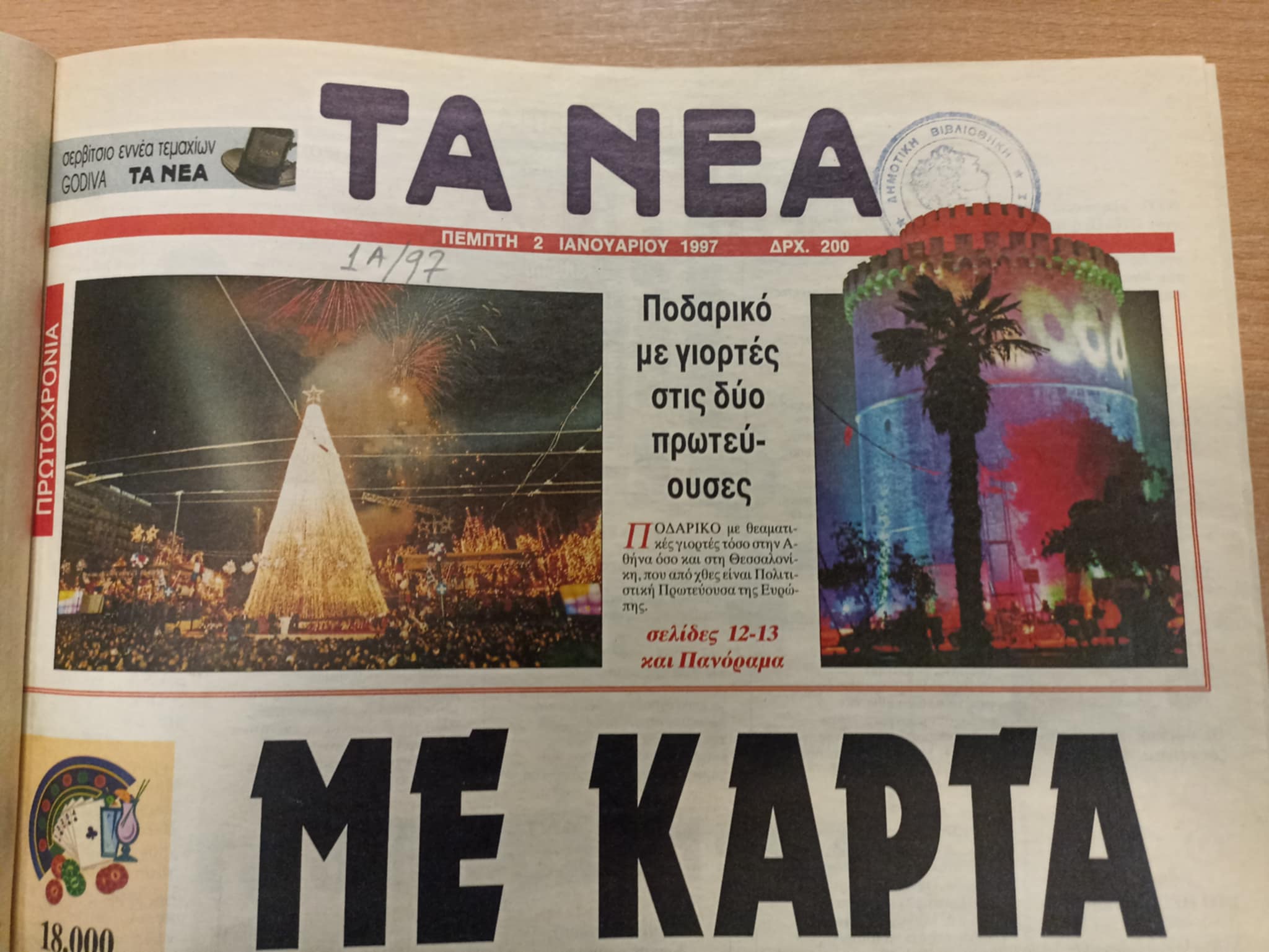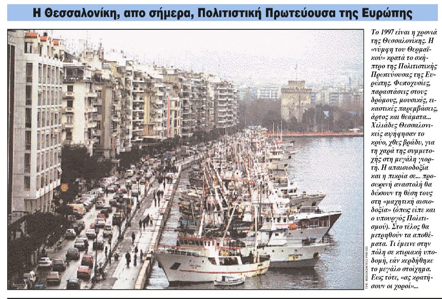 Στην «Καθημερινή» στο κεντρικό κομμάτι του πρωτοσέλιδου με τίτλο «Η Θεσσαλονίκη από σήμερα, Πολιτιστική Πρωτεύουσα της Ευρώπης» διαβάζουμε: Το 1997 είναι η χρονιά της Θεσσαλονίκης. Η «νύμφη του Θερμαϊκού» κρατά το σκήπτρο της Πολιστικής Πρωτεύουσας της Ευρώπης. Φωτοχυσίες, παραστάσεις στους δρόμους, μουσικές, εικαστικές παρεμβάσεις, άρτος και θεάματα…