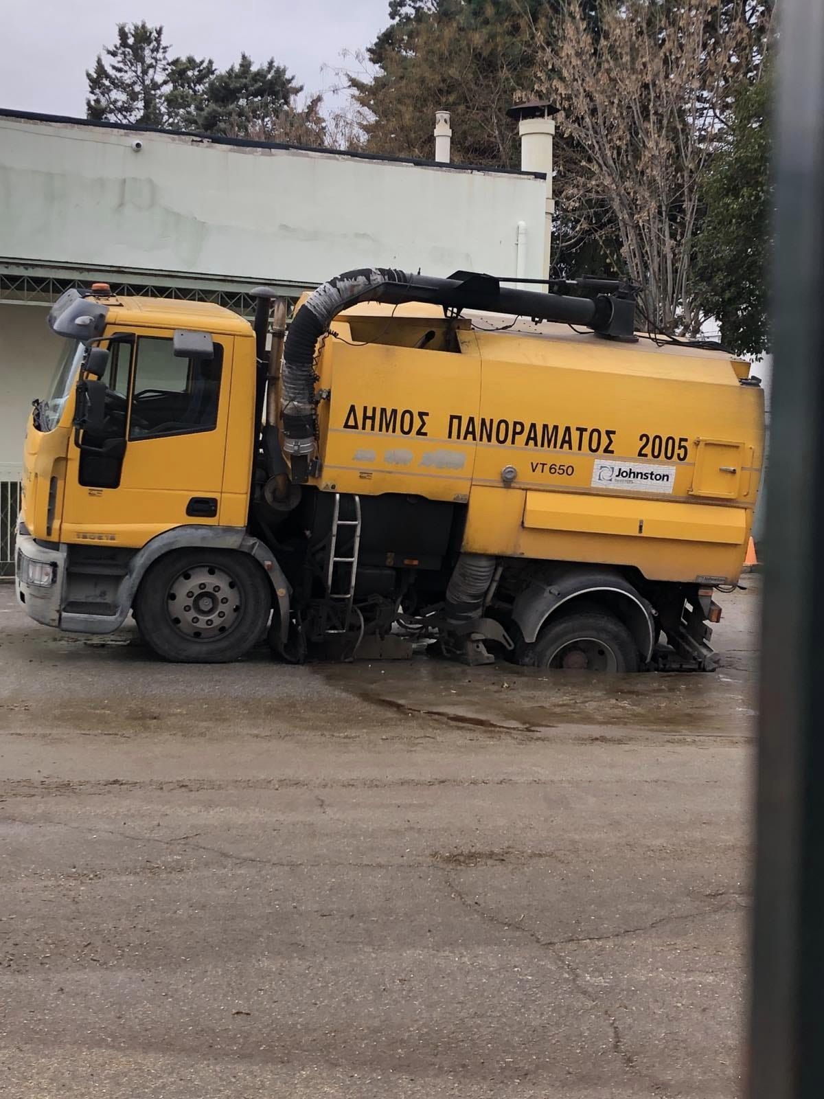 Το περιστατικό σημειώθηκε όταν το δάπεδο της αυλής δεν άντεξε το βάρος του οχήματος του Δήμου που βρισκόταν εκεί, με αποτέλεσμα να υπάρξει καθίζηση στο σημείο, με αποτέλεσμα το όχημα να εγκλωβιστεί και αυτό.