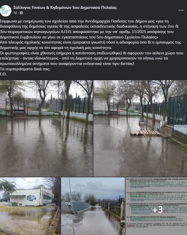 Με αφορμή την κακοκαιρία των τελευταίων ημερών, ο Σύλλογος Γονέων και Κηδεμόνων του 5ου Δημοτικού Σχολείου Πυλαίας, προχώρησε σε μία καταγγελία, που αφορά και την ειλημμένη απόφαση συστέγασης στο ίδιο κτίριο δύο Πειραματικών Νηπιαγωγείων του ΑΠΘ, του 2ου και του 3ου.
